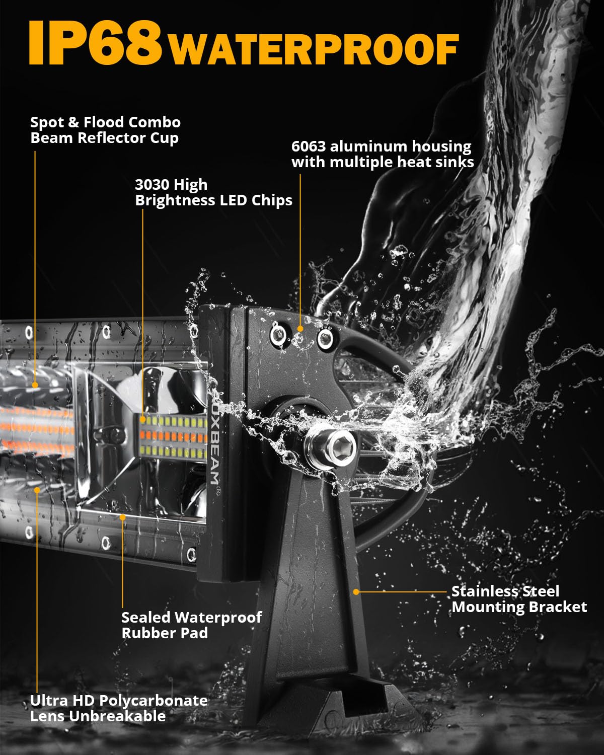 Q: Is the Auxbeam LED light bar waterproof and suitable for harsh environments?A: Yes, the Auxbeam LED light bar has an IP68 waterproof and dustproof rating, ensuring it remains stable and functional even in harsh weather conditions.