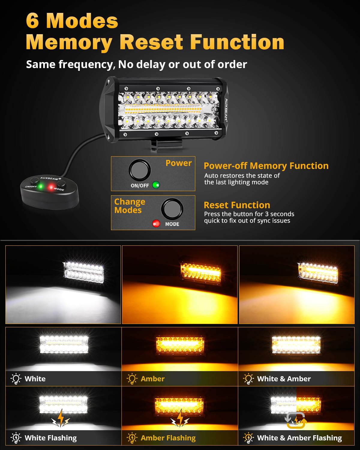 Q: What are the different modes available on the Auxbeam 7Inch LED Light Bar?A: The Auxbeam 7Inch LED Light Bar features six modes: 1) white driving light, 2) amber fog light, 3) combined white and amber light, 4) white flashing light, 5) amber flashing light, and 6) a white and amber strobe light. This versatility allows for optimal visibility in various conditions.