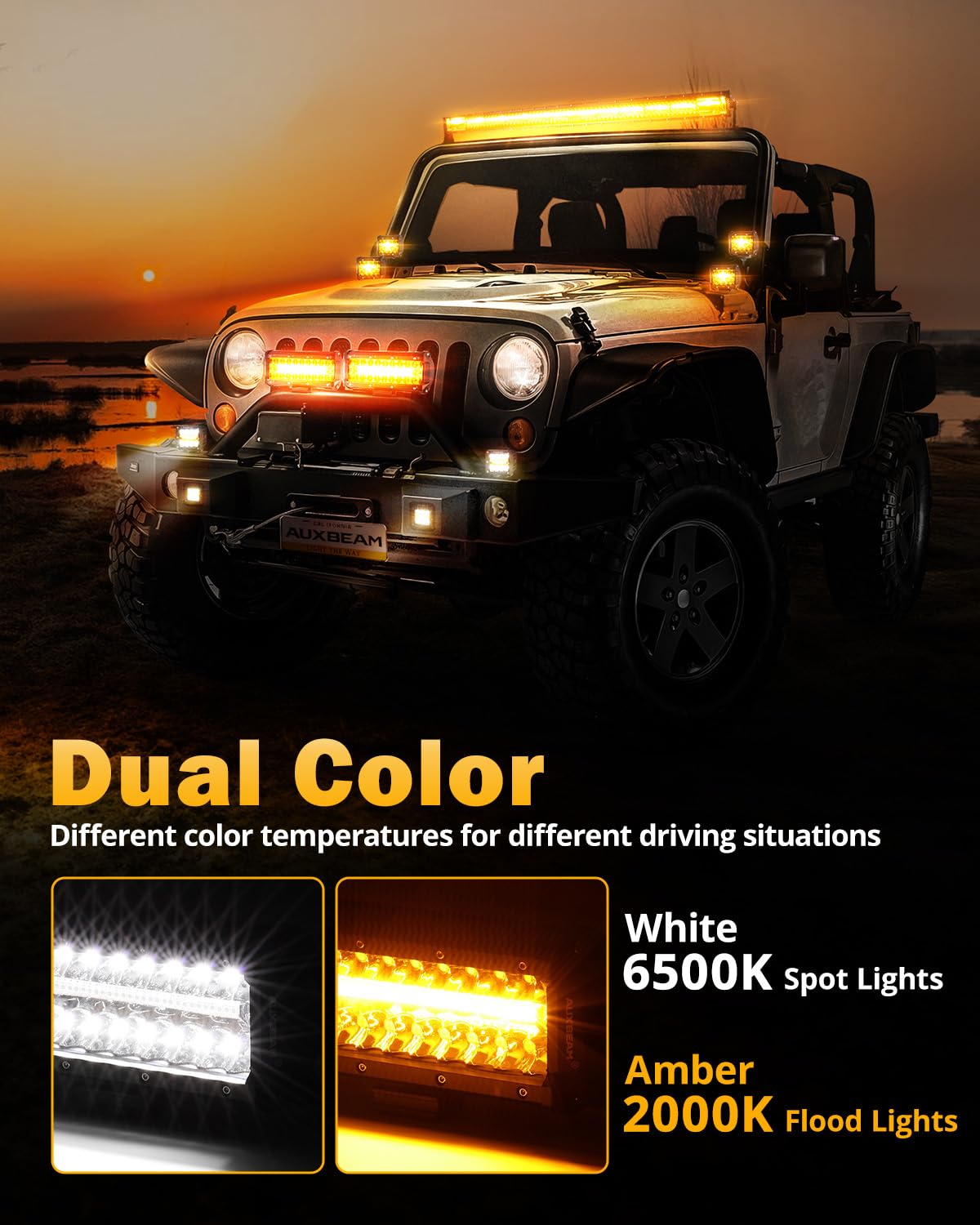 Auxbeam 7Inch 300W Amber LED Light Bar 6 Modes Amber and White Lights Spot Flood Combo Strobe Light Pods Offroad Fog Light for Truck Car ATV UTV Boat Jeep Wrangler