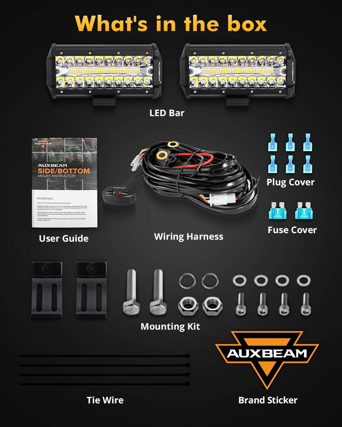 Q: What kind of installation accessories are included with the light bar?A: The Auxbeam package includes 2PCS 7Inch LED Light Bars, a 10FT customized wiring harness with 2 leads, and a set of mounting accessories. This makes installation straightforward for most vehicles, including trucks, cars, ATVs, UTVs, and boats.