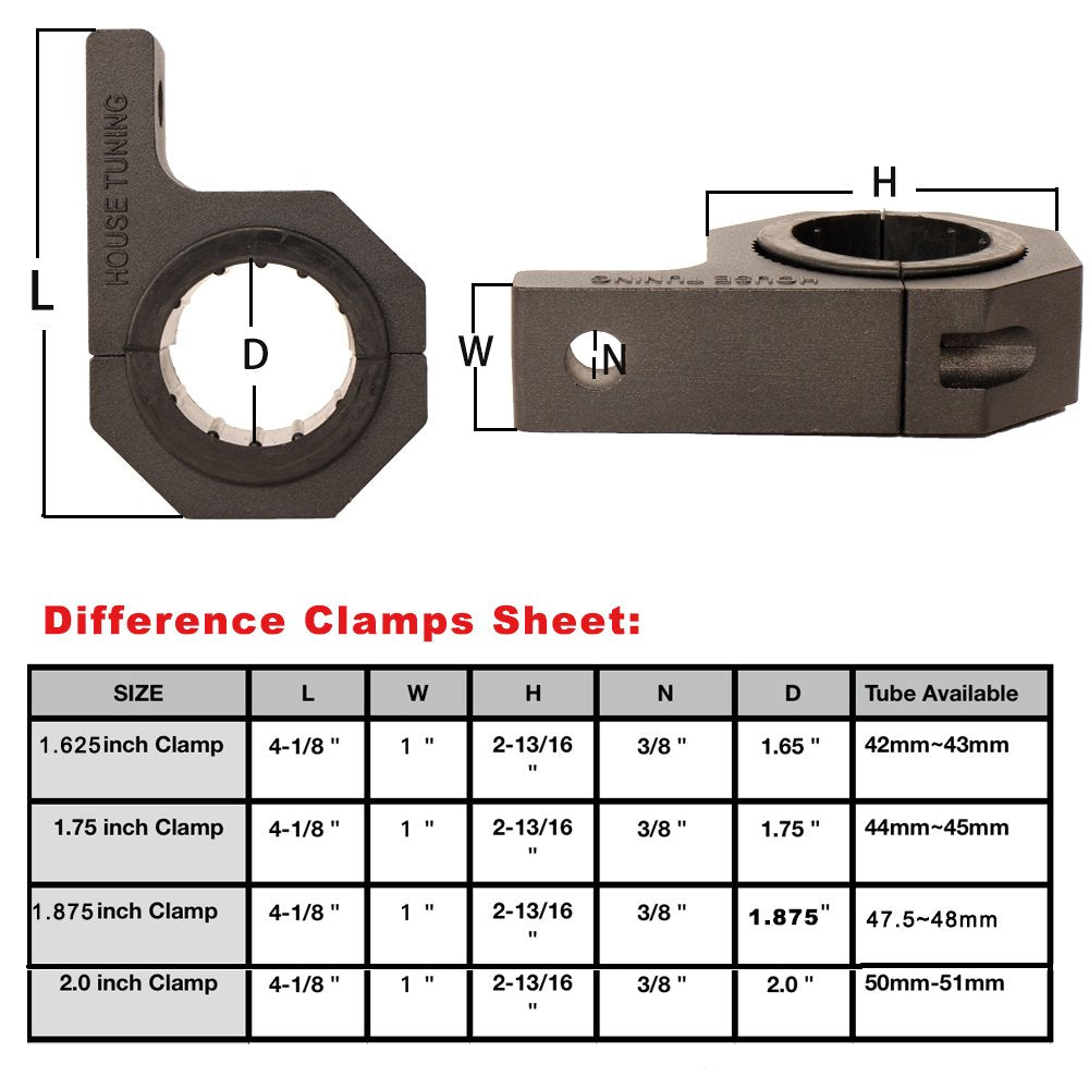 House Tuning Horizontal Bar Clamp Mounting Kit simplifies the installation of the House Tuning off road LED light bars and LED Driving light onto your roof rack, bull bar, or headache rack. The kit can be used for tubes sized at 0.75',0.875',1.0',1.125',1.25',1.5',1.625',1.75',1.875',2.0' in diameter. Interchangeable/Compatible: All sizes of House Tuning Series LED Light Bars and Pods lights Features: Simplifies installation and small size Can be used on tubes of 1.625' inn diameter. Package include: 4 x Clamp 4set x Rubber Insert for 1.625' tube (8pieces) 1 Set x Mount Screw with Allen Hex Key