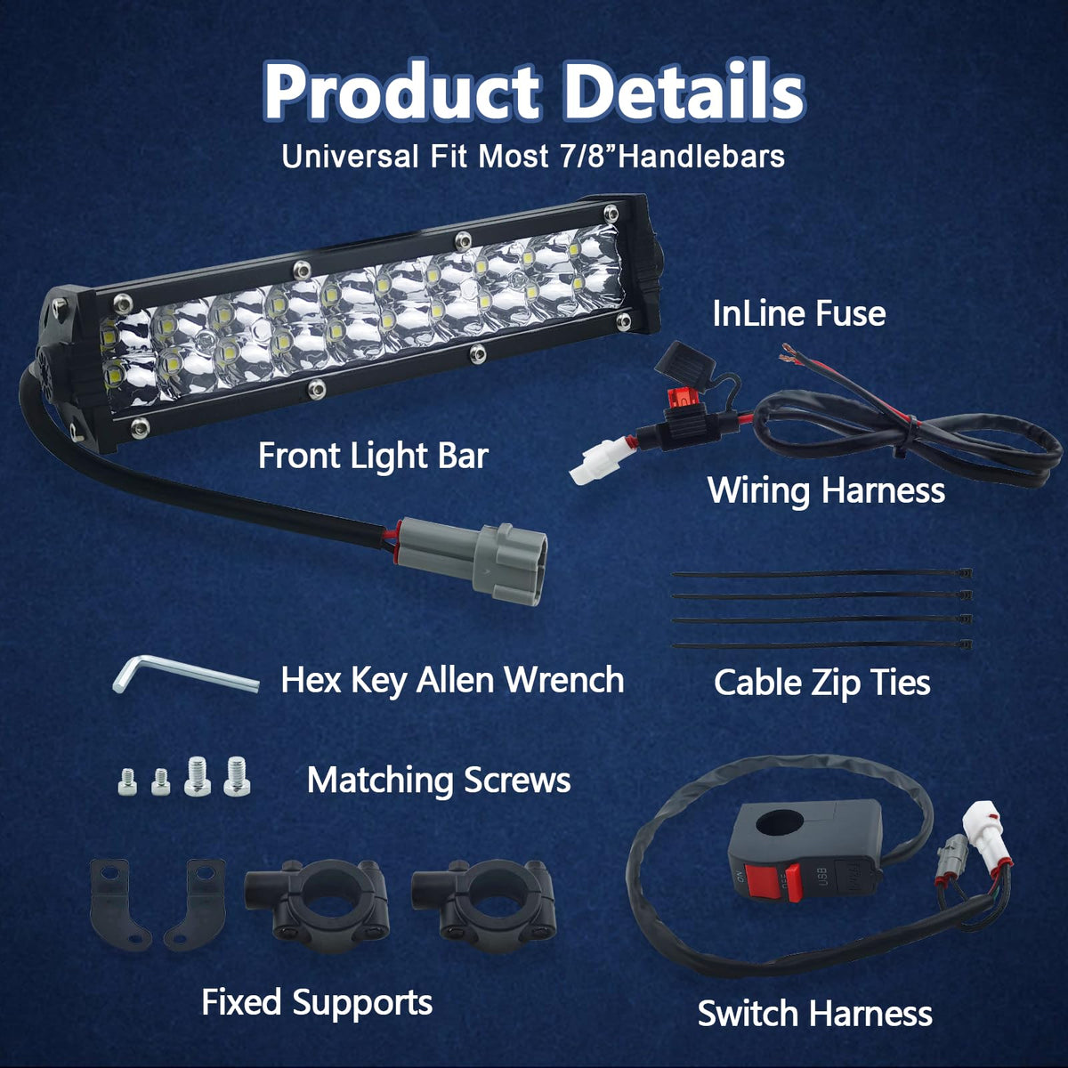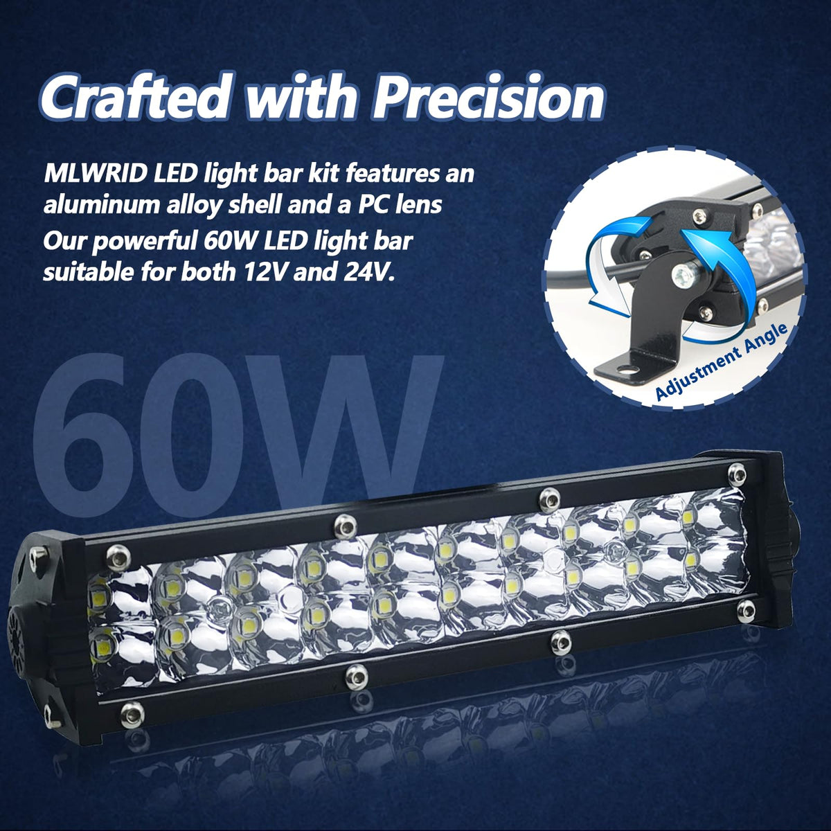 Q: How bright is the LED light bar in this kit?A: The LED light bar in the MLWRID Dirt Bike Light Bar Kit delivers an impressive 60W of power, providing exceptional illumination for both 12V and 24V vehicles, ensuring visibility in all conditions.
