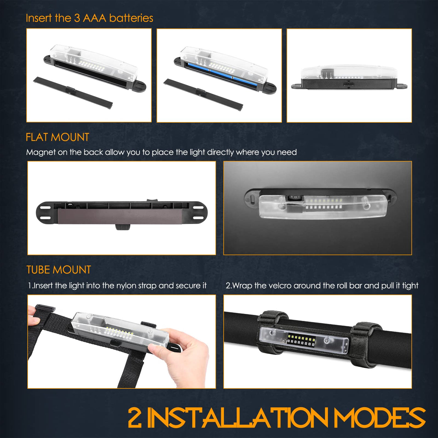 Q: How do I install the Nirider UTV Interior Light?A: Installation is simple and requires no drilling or wiring. Just insert 3 AAA batteries (not included), and you can either attach the strong magnet base to a flat surface or use the secure velcro strap to wrap it around any tube with a diameter of up to 4 inches.