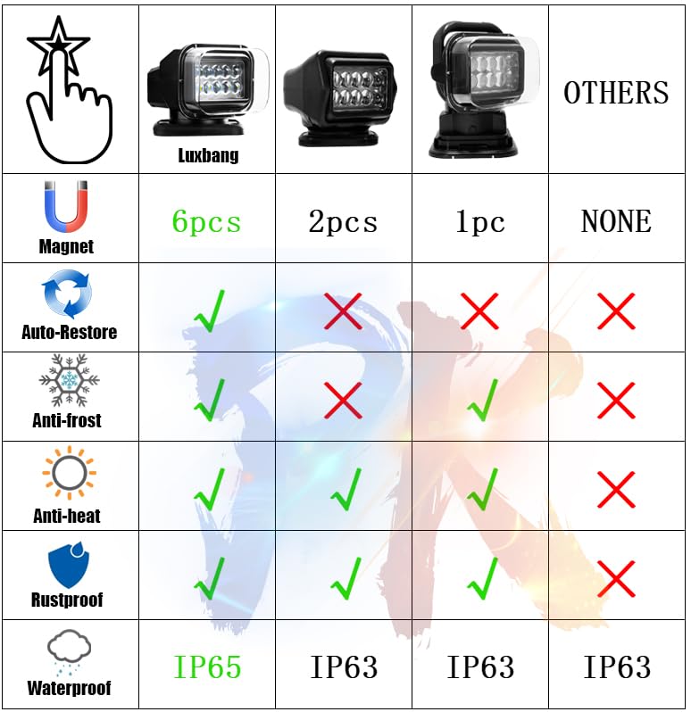 Remote Led Search Light, Auto-Reset 360 Rotating Marine Spotlight For Boat, 6 Strong Magnets Built-In Go Outdoor Spot Light For