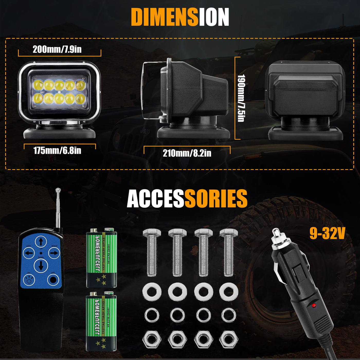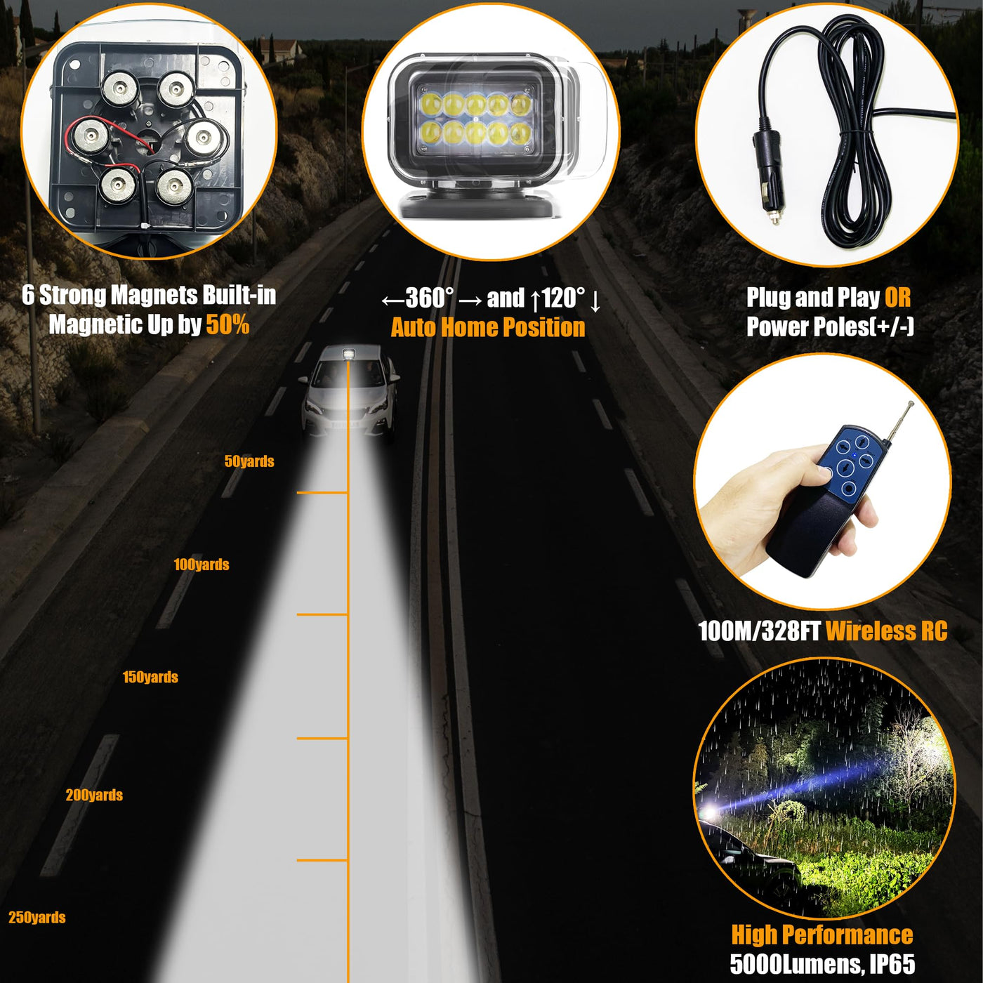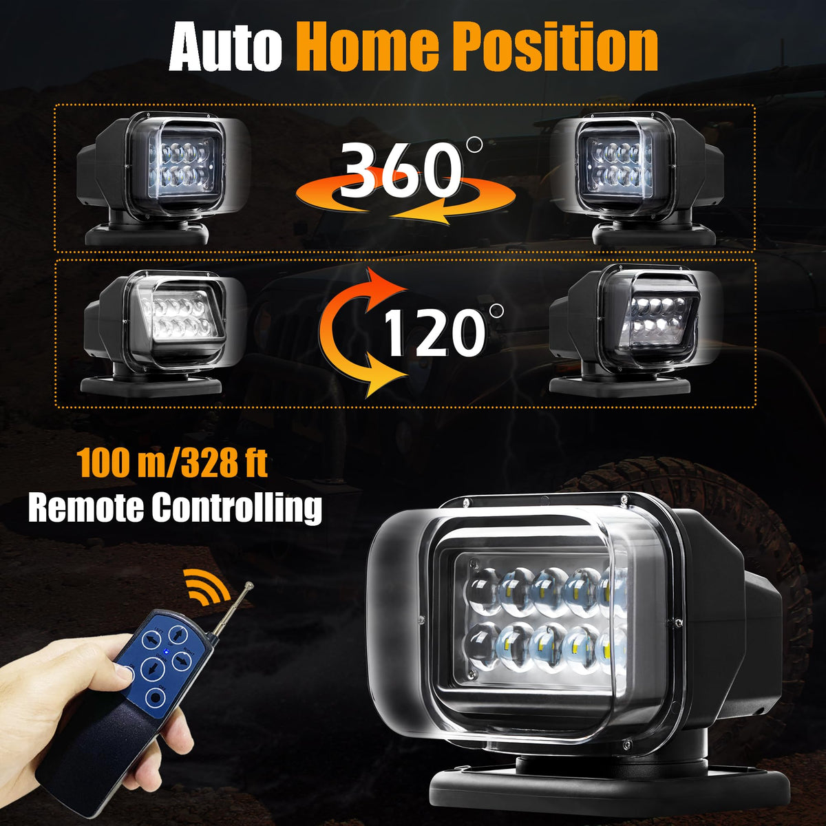 Remote Led Searchlight Illuminate Your Outdoor Path With The Remote Led Searchlight, An Auto-Reset 360 Rotating Search Light Designed For Trucks And Boats. This Powerful Lighting Solution Casts A Bright Beam That Cuts Through Darkness, Ensuring Optimal Visibility And Safety During Nighttime Operations Or Emergencies. With Its Rugged Construction And Waterproof Design, This Remote Spotlight Withstands The Toughest Conditions, Making It An Essential Accessory For Off-Road Adventures, Marine Activities, Or Any Situation Where Reliable Illumination Is Paramount. Easily Controlled Via Wireless Remote Controller, The 360-Degree Rotation Allows You To Direct The Light Precisely Where Needed. Upgrade Your Vehicle Or Vessel With This Versatile And High-Performance Led Spot Light For Enhanced Visibility And Peace Of Mind On The Road Or Water. Go Anywhere With This Light For Truck. Package Includes Led Remote Control Searchlight With 6 Pcs Strong Magnets*1 Wireless Remote Controller*1 Batteries For Remote Controller*2 Mounting Screws*4 Parameters Light Source:Led Size:200*210*190Mm/7.9*8.3*7.4In Voltage: 9-32V Power:50W Lumen: 5000Lm Peak Beam Intensity:350000 Candelas Color Temp:6500K Rotating: 360,120 Unlimited Continuous Rotation Durable Integrated Motor: 2Pcs Rc:Wireless Lighter Cable: 3 Meter Material:Abs+Aluminum Alloy Weather Resistance: Anti-Uv/ Anti-Salt/Ip65 Color: Black Mount Type: Portable Magnetic Base (Permanent By Screws Optionally) Automatically Return To Home Position When Switched Of