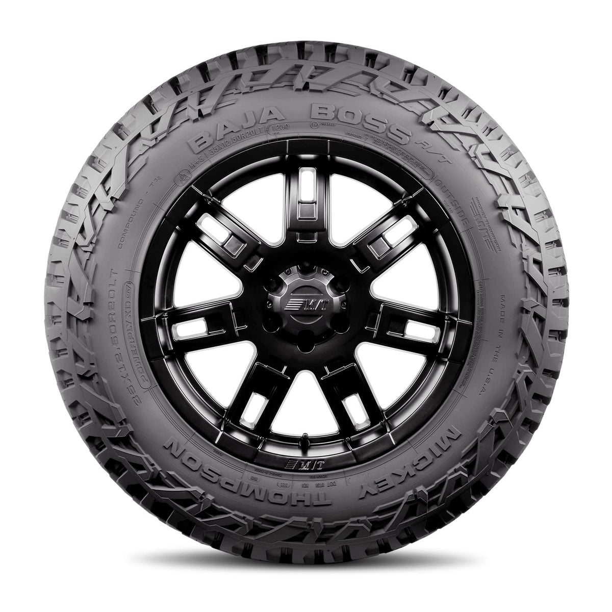 Mickey Thompson's Baja Boss A/T is an ultra premium, hybrid all terrain tire that takes the best features of the Baja ATZ P3 and improves upon it dramatically to meet today's demands for performance and quality. Ideal for use on smaller trucks, dually applications, and wide wheel fitments, the Baja Boss A/T's all new silica reinforced compound increase all weather traction, improve on road tread wear, boost cut and chip resistance, and strengthen wet handling and braking performance.
