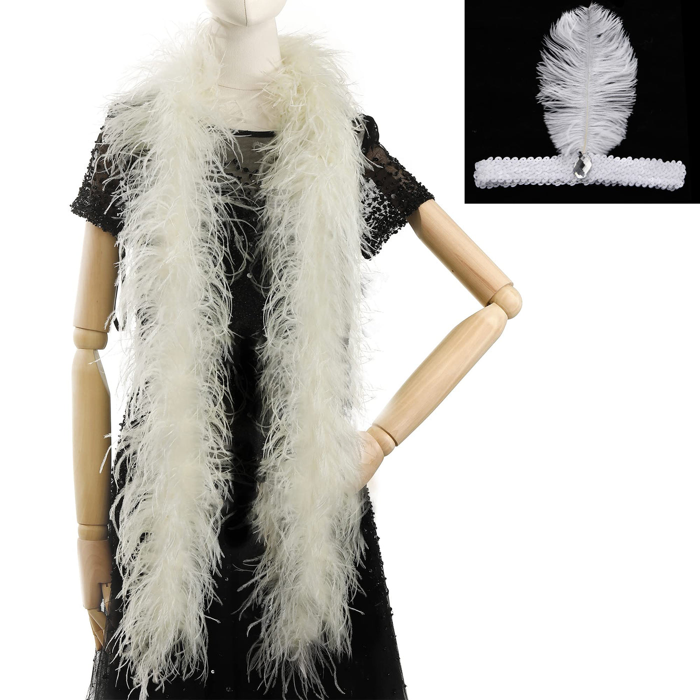 Q: What materials are used in the production of this boa?A: The Soarer Ivory Ostrich Feather Boa is made from natural ostrich feathers, ensuring a fluffy and luxurious look. Each boa is handmade and professionally processed to retain its quality.