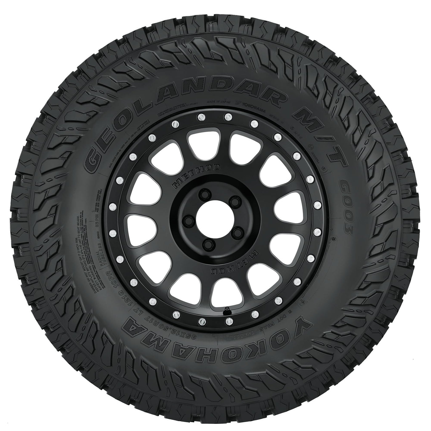 The Yokohama Geolandar M/T G003 is a mud-terrain tire that's designed for SUVs, crossovers, and pickup trucks, and features an aggressive tread pattern for superb grip and traction and GEO-SHIELD technology that protects its casing and tread for longer tread life. While optimized void ratio and sipes provide shorter stopping braking distances and increased grip, the mud and stone ejectors clear tread consistently to limit stone drilling and improve traction. Protecting the mud-terrain tire are the sidewall armor and GEO-SHIELD technology that features a high turn-up carcass, a full nylon cap, and multiple sidewall plies. Backed by Yokohama's 30-day satisfaction guarantee, the Geolandar M/T G003 is available in different sizes such as 15, 16, 17, 18, 20, 22, and 24 inches.