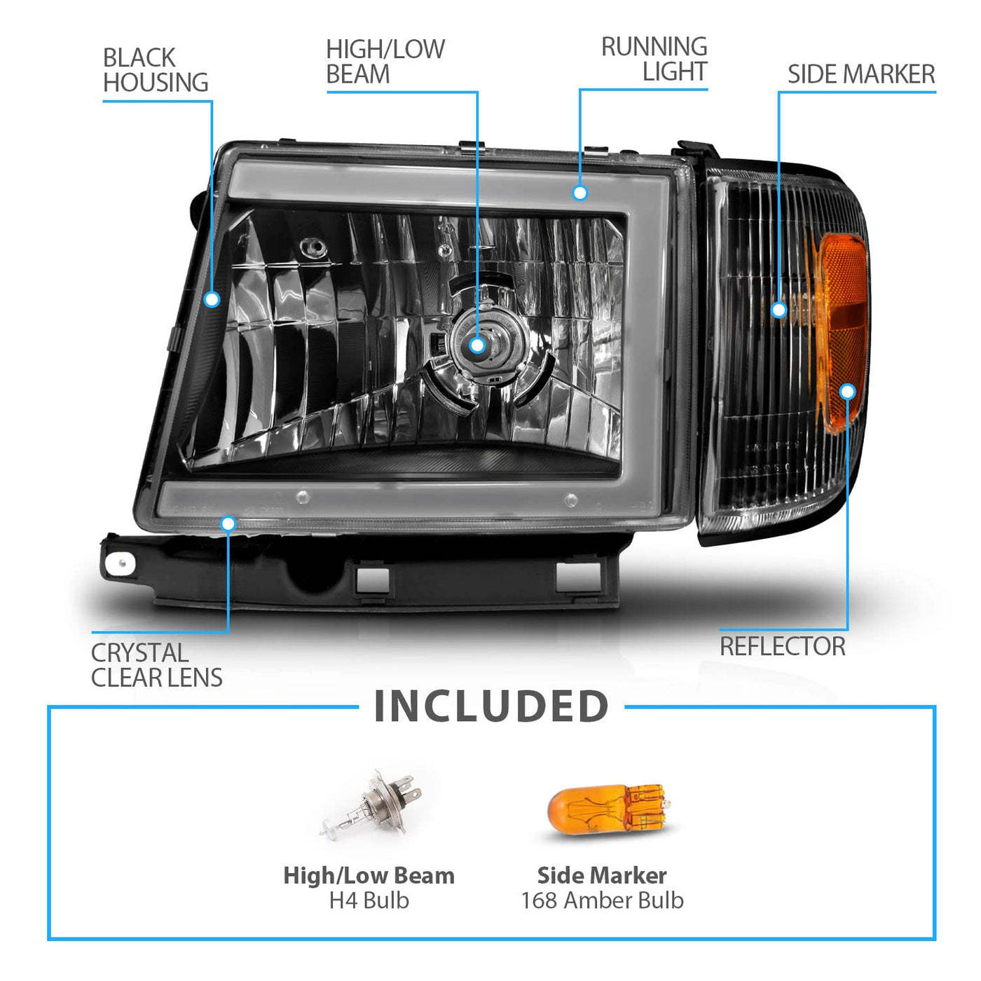Amerilite For 1997-2000 Toyota Tacoma 2Wd Pickup Led Tube Black Reaplcement Headlights + Corner Light Set - Passenger And Driver Side