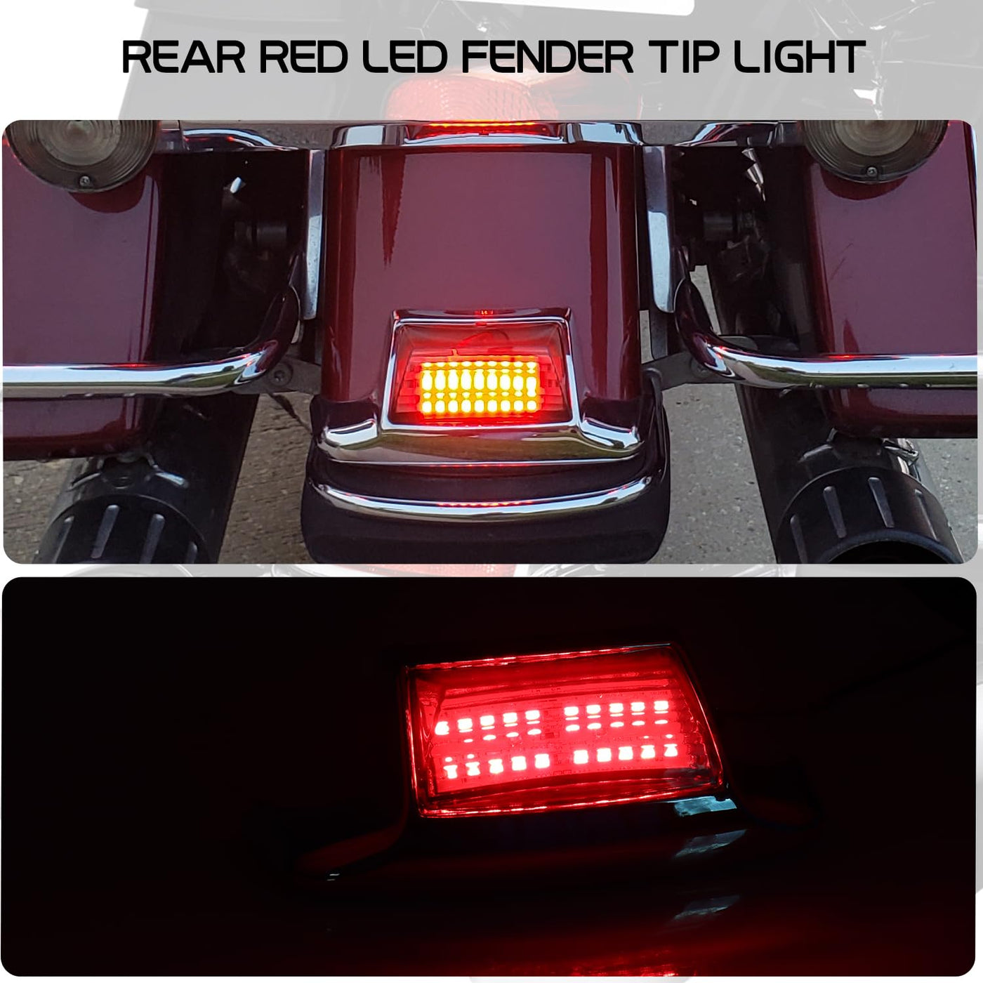 ?Compatibility?Fit harley touring models, such as 1986-2017 FLSTC, 1993-1996 FLSTN and 1980-2008 FLHR, FLHS, FLHT and FLT models, etc. For more suitable models please refer to amazon confirmed fit. | ?3X Brighter Than Halogen Bulbs?Built in high power SMD led chips, 3x brighter lighting output than halogen bulbs, greatly increased your visibility while riding at night, make your driving safer. | ?Sleek & Modern Design? The smoked lens adds a stylish, modern touch to your motorcycle while maintaining clear visibility without weakening the LED lighting. The integrated fender tip trim design perfectly contours to fender tips. | ?Easy to Install?Easy to install, you will need to use the existing plug from your tail light and splice it onto the bare wires that come with the new light. You may need to use your stock wires or add additional wires. Made of high quality ABS plastic, anti-scratch, metal bracket processed with black anodized finish, anti-oxidation, anti-corrosion, prolong the life service time. | ?What You Will Get?1Pcs rear fender tip light. You are backed by 3- Month since from order purchasing, please contact us if you have any questions. Solutions will be offered once detail is confirmed.
