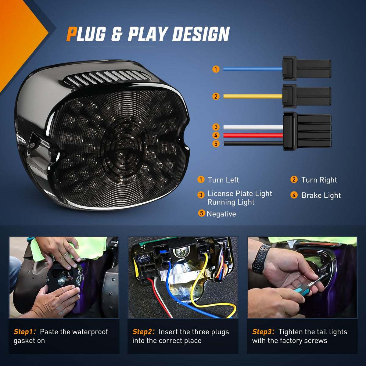 ?Worth Upgrading?With 60Pcs High Intensity Led Chips, Bright Enough And Over 50000 Hours Lifespan, Increased Rear Visibility Which Is Easier To Notice By Other Vehicles On The Road For Safe Driving | ?Multiple Functions All In One?This Taillights Can Be Used As Running Light, Brake Light, And Turn Signal Light(Turn Left/Right), Also Come With Extra License Plate Light. All Modes And Functions Are Built Together Which Are More Practical Than The Original Taillights | ?Plug And Play?Easy To Install Within A Few Minutes, Plug And Play Design, Compared To Others, We Also Upgrade The Turn Signal Wire To A Plug Style, Just Plug 3 Plugs To The Corresponding Position On The Rear Of Your Motorcycle To Complete The Installation, No Need For Any Hardwired | ?Compatibility?Fits For Harley Sportster 883, Sportster 1200, Dyna, Tour Glides, Road Glides, Road Kings, All 1991-2010 Flst Models (Except 1991-2000 Flstf, 2005-2010 Flstn, 1997-2003 Flsts, 2005-2007 Flstsc, 2010 Flstse); All 2002-2010 Fxst Models (Except 2002-2007 Fxstd, 2007-2009 Fxstsse, 2008-2010 Fxcw/C);1991-2010 Electra Glides (Except 2005 Flhtcse, 2009 Flht Standard) | ?Package Included?1 Pcs Smoked Housing Led Tail Light, 1 Pcs Gasket