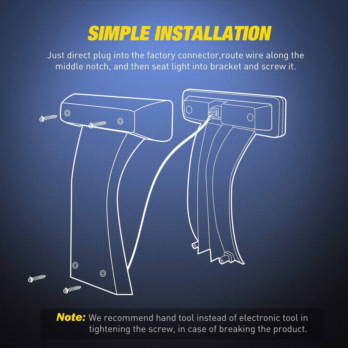 Q: How do I install the Nilight LED Third Brake Light?A: Installation is simple and follows a plug-and-play method. Connect it to your factory 3rd brake wire connector, route the wire along the middle notch, and secure the light into the bracket. Note: It is recommended to use hand tools instead of power tools to avoid damage.