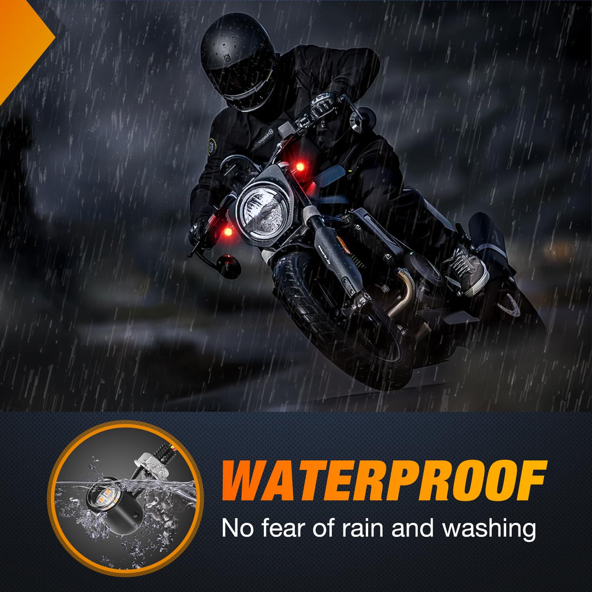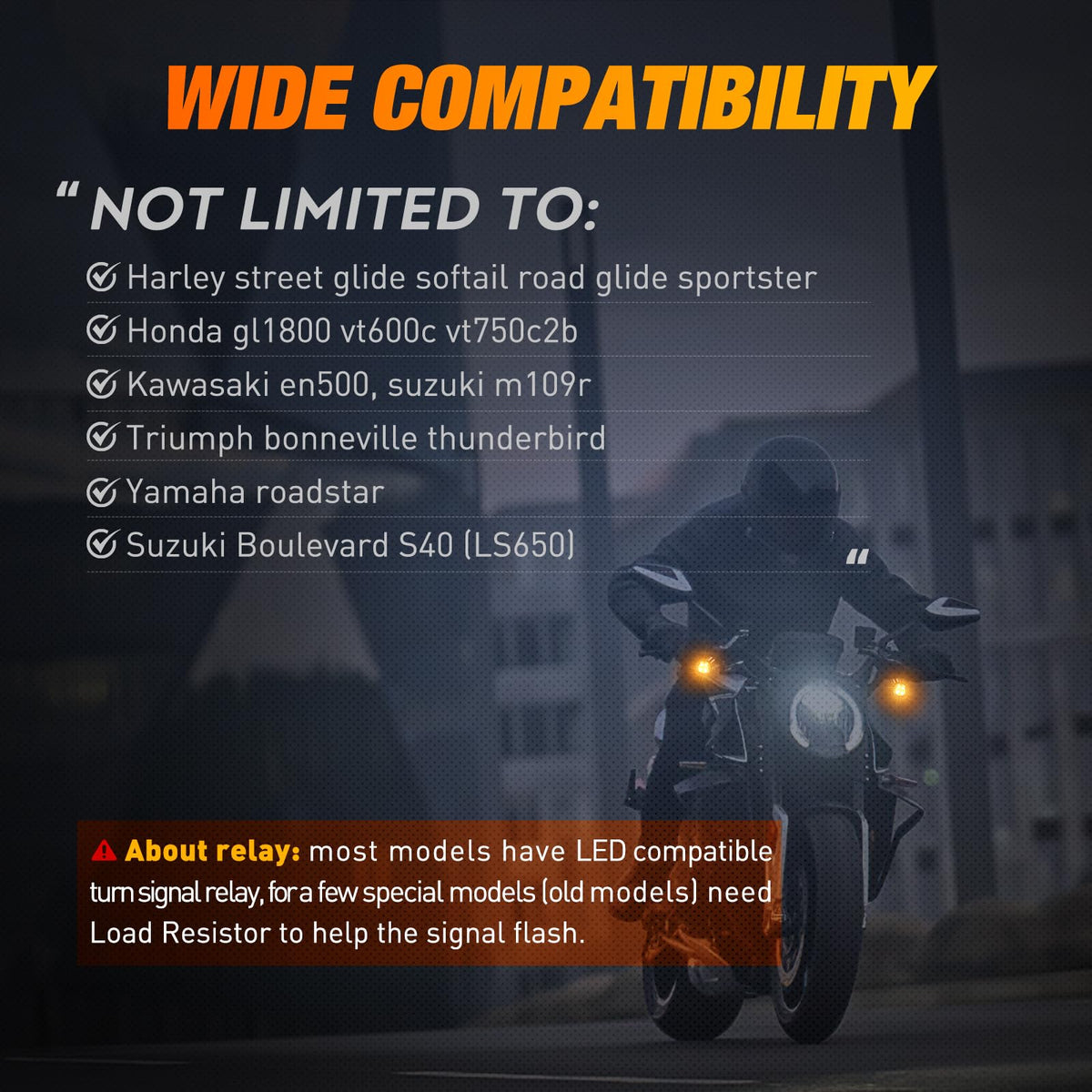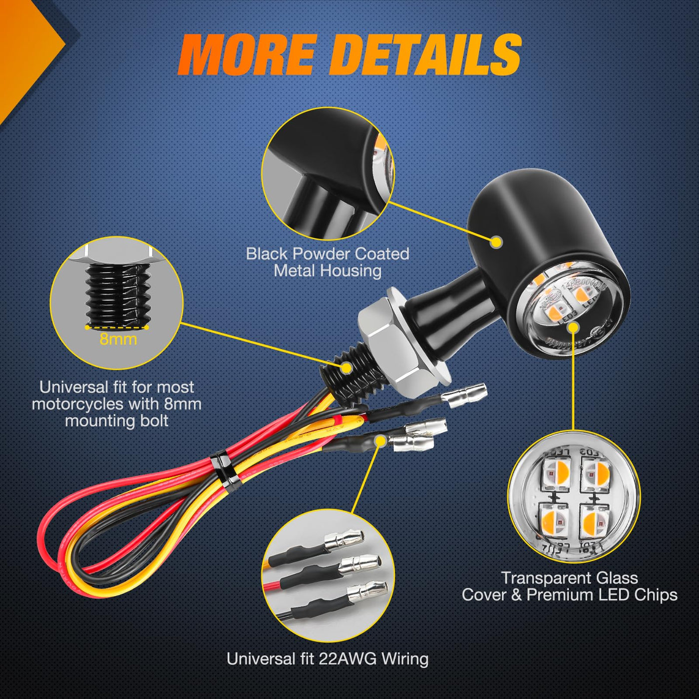 ?Small But Bright?Equipped With 4Pcs High Power Smd Leds Per Light, Mini Size But Much Brighter Than Halogen Bulbs, Makes It More Noticeable When Driving To Increase Safety, Also Enhances The Look Of Your Motorcycle To More Modern, Stylish, And Functional | ?Excellent Quality?Made Of Matt Black Painting Aluminum Alloy Shell And High-Quality Glass Lens, Not Easy To Corrosion Or Scratch, Fully Sealed On The Edge, With Good Water Resistance, Ideal For Outdoor Use | ?Easy Installation?If Your Original Blinker Has 8Mm Mounting Bolts, Just Remove The Original One And Then Replace The New Light; If No Suitable Hols, Please Drill An 8Mm Hole Where You To Mount The New Turn Signals To Diy Your Motorcycle | ?Wide Compatibility?Universal Fit For 12V Dc Motorcycles, Motorbikes Scooter Scooter Quad Cruiser Off Road Street Bike Cafe Race And Other Motorcycles With 8Mm Mounting Bolt | ?Tips?Most Models Have Led Compatible Turn Signal Relay, But For A Few Special Models (Old Models) Need Load Resistor To Help The Signal Flash