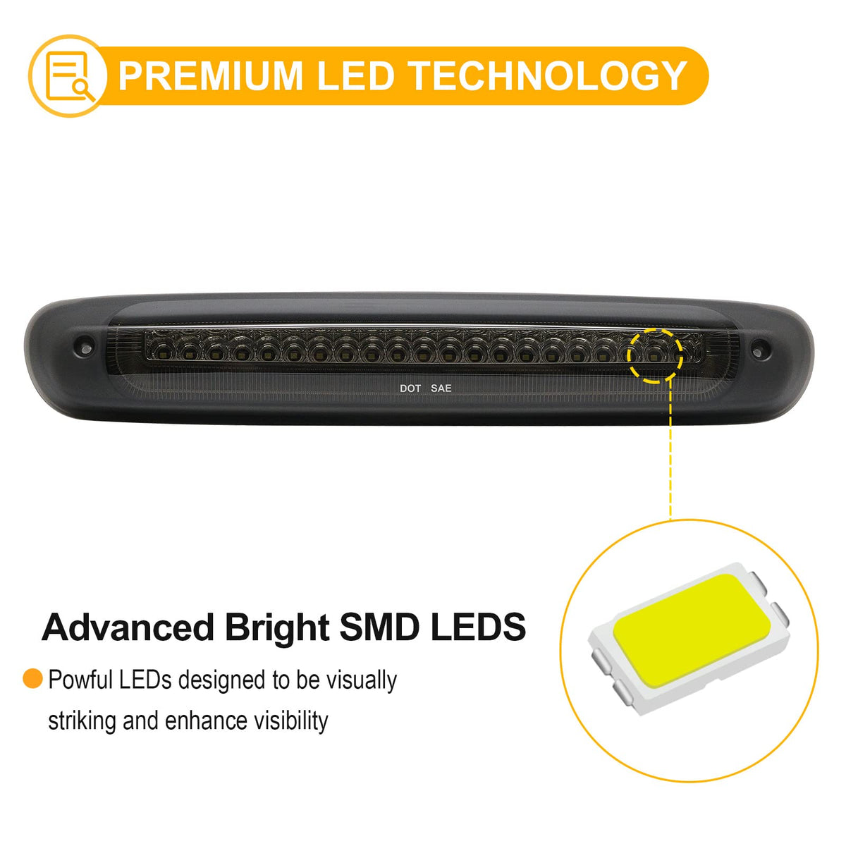 ?Compatible With?Street legal, SAE DOT approved. LED 3rd brake light compatible with Silverado/Sierra 1500 2500HD 3500HD (2007-2013), for Silverado/Sierra 2500HD 3500HD (2014). | ?Function?The third brake light is powered with SMD LED chips on technology of F1 Style Hyper Flash. With designed a strobe enable switch, transform your static brake light into error-free, strobe flashing red lamp when attempting to slow down. | ?Easy Installation?Plug and play installation, fit direct into your truck's 3rd brake lamps. It's quick and simple to replace or upgrade OEM third brake lamp. | ?IP67 Waterproof?This LED third stop light with high-density foam mounted back is IP67 waterproof, which will prevent from any sand, water, dirt, snow or dust leaking in. | ?Package?1pcs LED third brake light. 1 year warranty, if you have any questions, please contact us for free.