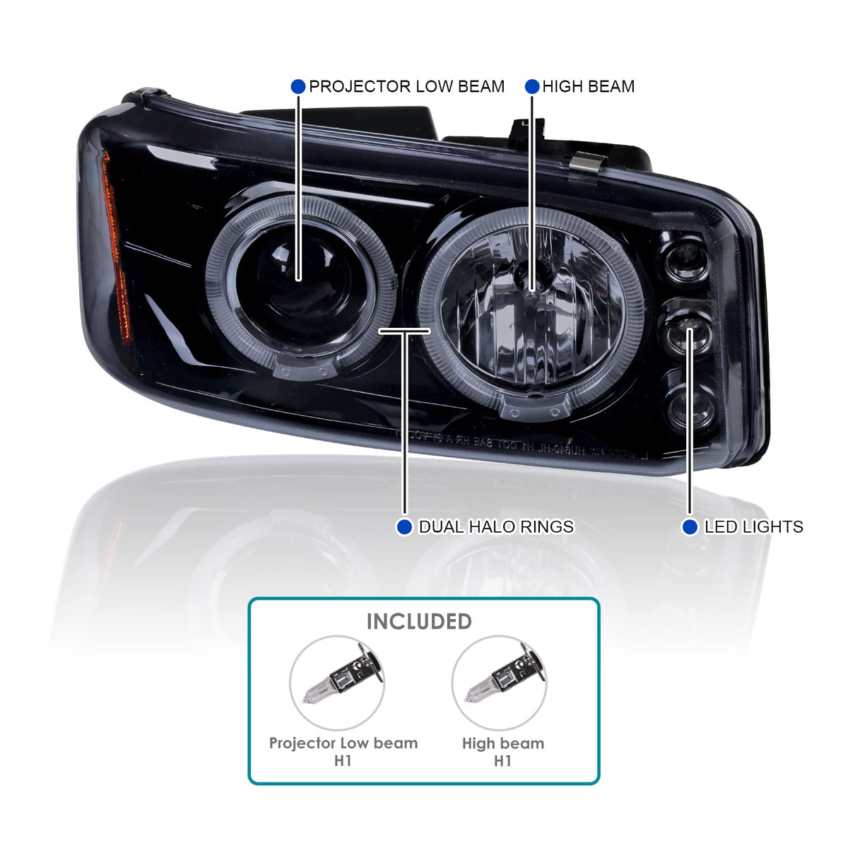 Spec-D Tuning Glossy Black Housing Light Smoke Lens LED Halo Projector Headlights + Bumper Lights Compatible with 2001-2006 GMC