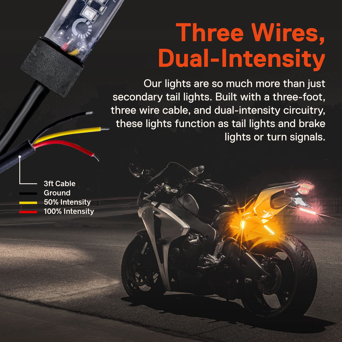 Be YouA bike is an escape, an escape from traffic, an escape from stress, and an escape from a cookie cutter commute. Enhance your bike and your motorized experience with a set of universal amber taillight LED strip lights. Our extremely bright 5” strip lights are packed with 15 LEDs to give you the cleanest look and make the biggest impact. And with an IP68 rated, fully silicone sealed body, these lights will continue to look great even after years of hard use.Better Than The RestWhile most other companies are content to play it safe and follow the crowd with their accessories, we wanted to create lighting that would stand out above the rest. With a three wire cable that allows them to function as turn signals and driving running lights, these amber strip lights give your bike an added level of visibility and safety that a single function light strip bar just can’t match.Adapt To WinAt True Mods we understand that quick thinking and adaptability are the keys to success. So we designed our lights with a low-profile, extremely flexible body ideally suited to the tight corners and flowing lines of your bike and an easy to install adhesive backing that keeps your lights locked down and flat even in the most extreme situations. And with a three-foot cable, these lights are prepared to go anywhere you want them to whether it be the front, left, right, rear or above your license plate. What's Included?(2) Motorcycle Light Strip(1) Instruction Manual
