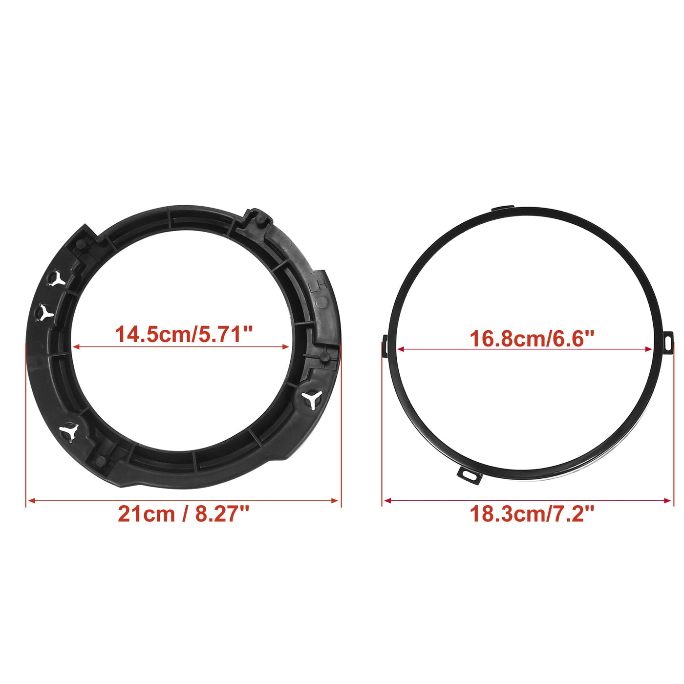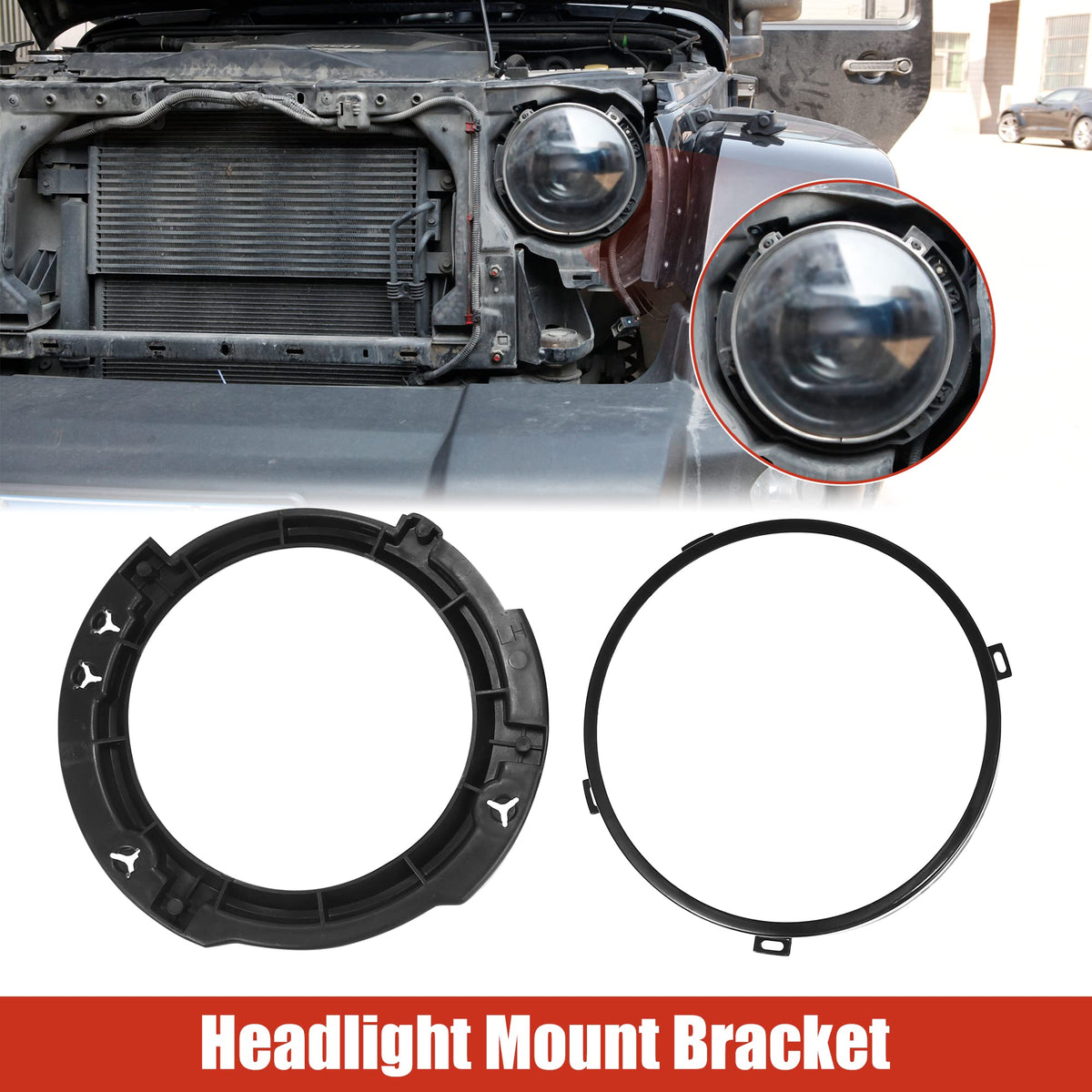 Feature:Function: The round inner bracket is anti-scratched and can protect the surface of cars. Provides a fashionable look for the headlight.Easy installation: No drilling installation, the light mounting bracket can be integrally mounted on the bracket or removed the bracket, mounted directly on the bottom of the headlight. With installation clips, the bracket can fix and decorate the headlight.Durable Material: Good quality ABS and metal can be used for a long time, is waterproof, and is corrosion-resistant.Replacement: It is a good replacement for the old or broken one, match for the original.The package includes a headlight mounting bracket. It doesn't include a headlight ring.This is a non-OEM product, accessory only!Specification:Material: ABS, MetalColor: BlackPlacement on Vehicle: Front, Left, RightInner Diameter: 14.5cm/5.71''Dimension: 21x1.6cm/8.27''x0.63''(D*T)Metal Ring Inner Diameter: 168mm/6.6''Metal Ring Outer Diameter: 183mm/7.2''Metal Ring Installation Hole Size: 9.5x3.8mm/0.37''x0.15''(L*W)Suit for 7 inch front headlight for Jeep JKFitment:for Jeep Wrangler JK 2007 2008 2009 2010 2011 2012 2013 2014 2015 2016 2017Package Include:1 Pair Headlight Mount Bracket (Left and Right)1 Pair Headlight Metal Ring (Left and Right)3 x Installation Studs8 x Screws