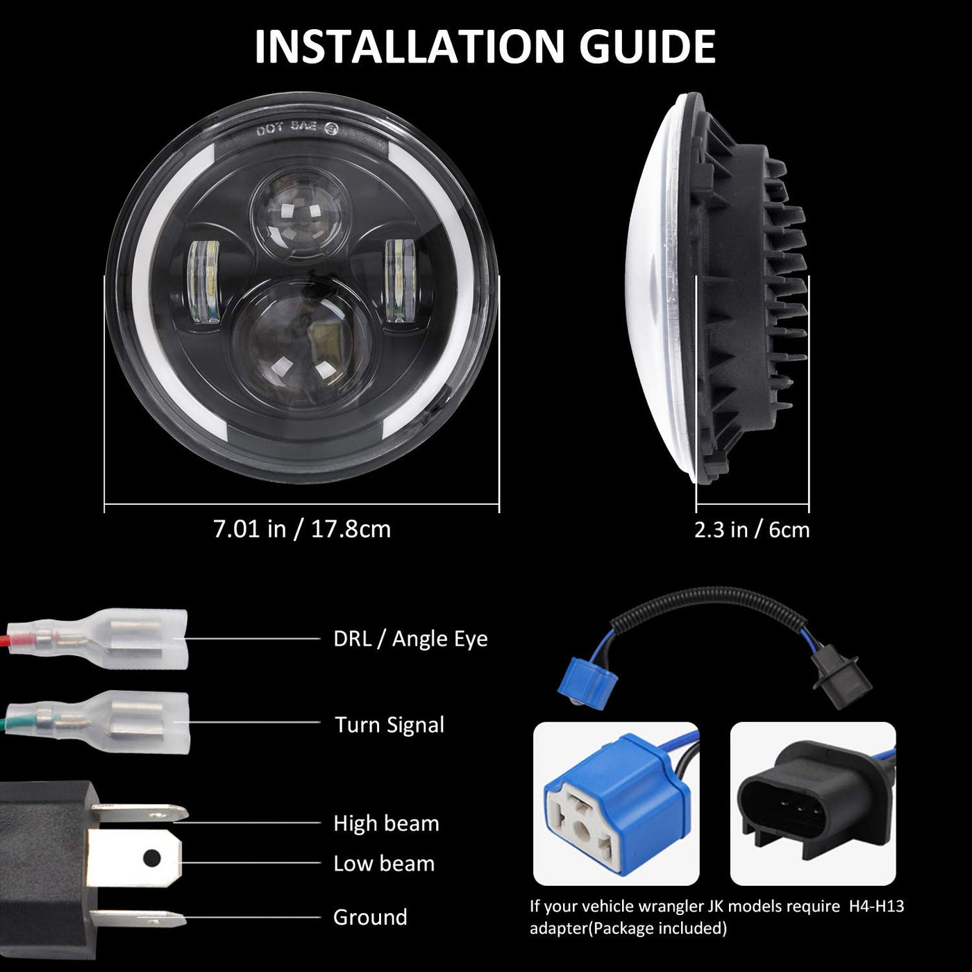 Plug and Play: The package includes H4-H13 adapters for easy installation. Note that the mounting bracket or housing is not included.
