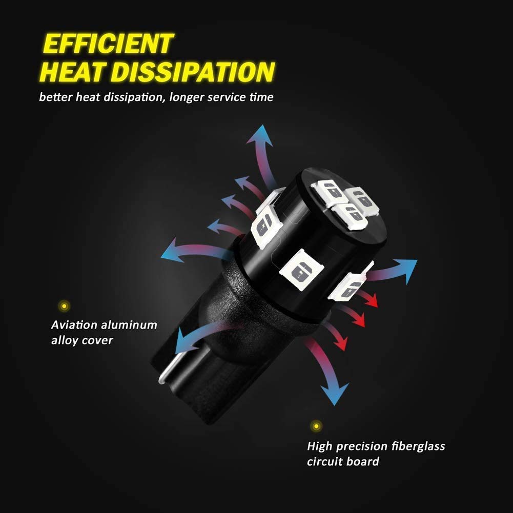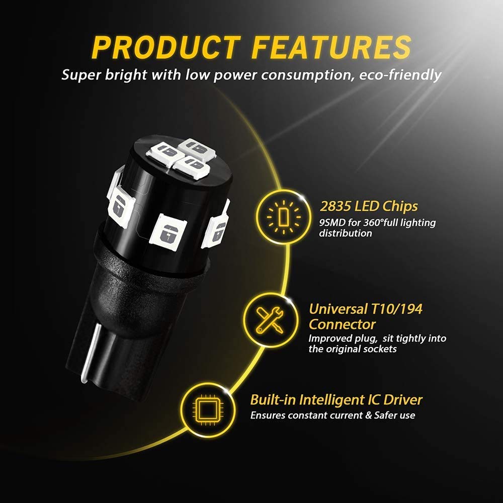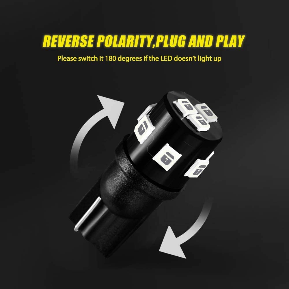 Ideal 194 168 2825 T10 replacement for dark and yellowish stock bulb: 1.(Pack of 12) Come with 9 pcs high quality 2835 LED chips, unique 360 degree lighting design, 300 lumens, green and 0.6W output, 300% high brightness compared to halogen bulb but requires only 1/3 of the power consumption. 2.High quality aluminum body and built-in IC current make the faster heat dissipation, long-lasting life up to 30,000 hours. 3.Faster on and off response time, no delay. IMPORTANT NOTICE!!! 1.Ensure the voltage of your vehicle is 12V. 2.please simply switch it 180 degrees if the LED bulb doesnt light up. 3.A load resistor or error decoder may be necessary for vehicles equipped with CANBUS system to bypass the error code. Warranty: 1.Our led bulbs will be tested before shipping. 2.Please contact with us at any times if you have any problem. 3.30 Days Return Guarantee and ONE Year Warranty.