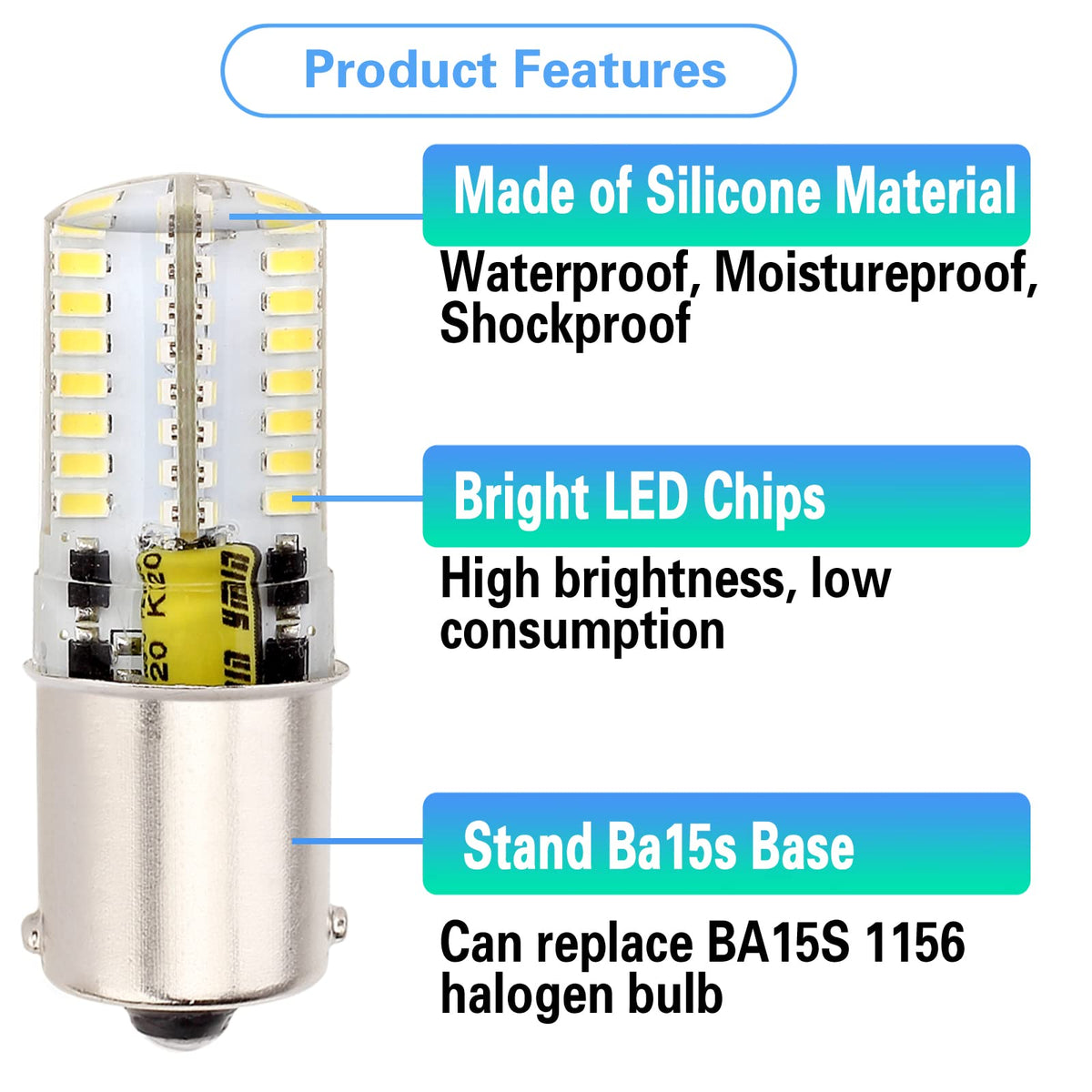 Led Ba15s P21w 1156 S8 Bulb 12V Ac/Dc Single Contact Base, 6 W White 6000K for RV, Reversing lights, Boat, Lawn tractors, Mower, Landscape Lighting. (Pack of 4) ??? Features:1. Made of silicone material, it has good waterproof function and No Heat, Built to Last.2. Use less current than incandescent And Much Brighter. has a service life of up to 30,000 hours.3. Applications: Reversing lights, backup lights, Landscape Lighting, RV, Camper, Outdoor Path Lighting Deck Lighting. etc.??? Specification:? Material: Silica gel? Power: 6 Watts? Lumen: 400Lm? LEDs: 64pcs LEDs? Input Voltage: AC/DC12-18V? Light Color: Cool White 6000K? Beam angle: 360 degree? Lamp Base: Ba15s Single contact? Dimension: f16*47MM(D0.63XL1.75 inches)??? Package includes:? 4* BA15s/1156 12V Cool White Led Bulb.??? If you have any questions or concerns, please contact us.