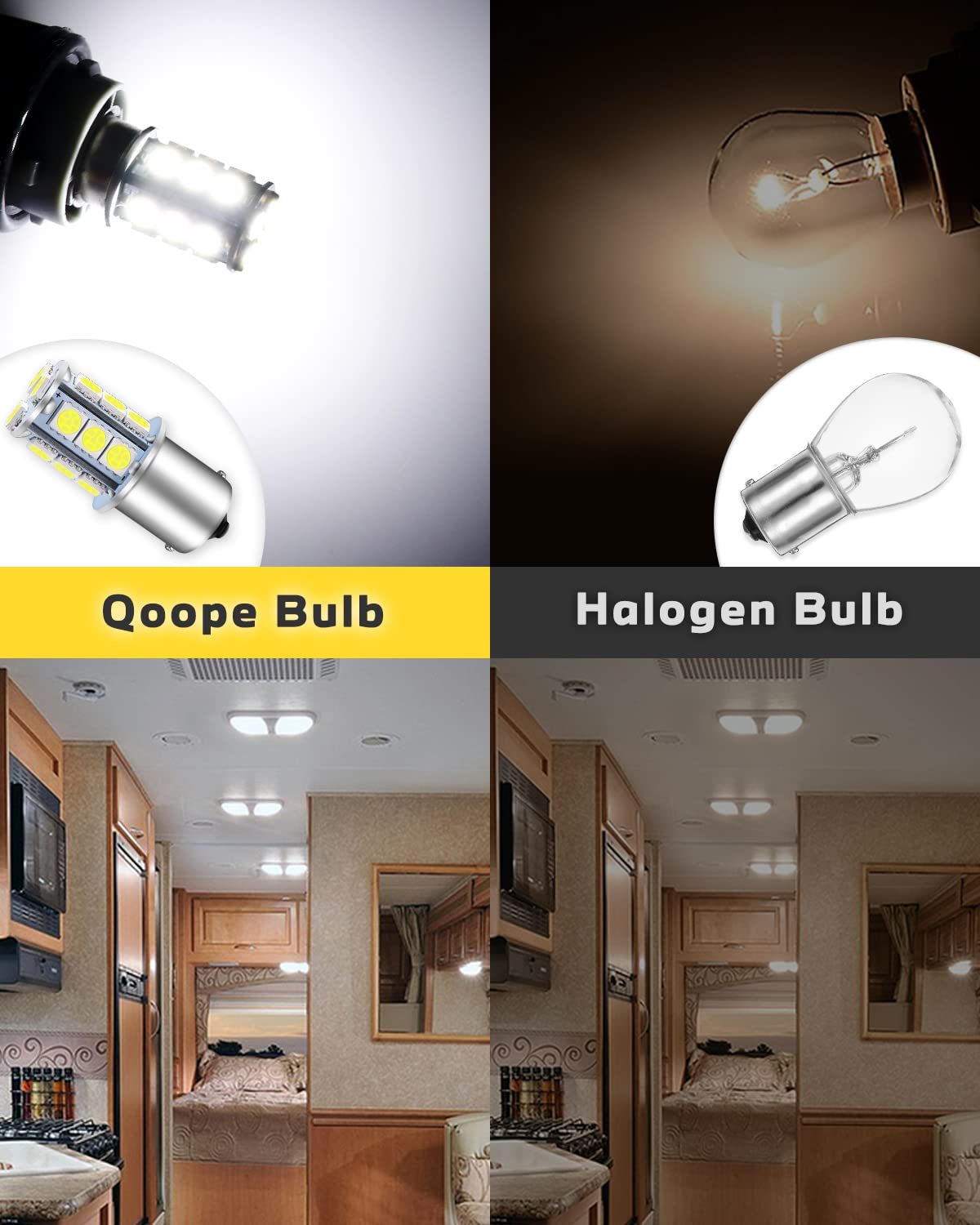 Specification:Standard Socket: 1156 1141 1003 7506 BA15SLED Chip Type: 5050 18SMDColor: 6000K WhiteVoltage: 12V DCPower: 1.7W/bulbLumens: 230 lum.Lifespan: 30,000 hoursBeam Angle: 360Quantity: Pack of 6THE ADVANTAGE OF THE 1156 LED BULBQoope 1141 led bulb is better to use for RV, because the cec1141 bulb is low power consumption and save energy, reduce the burden of energy.The 1003 led bulb is brighter than the original halogen bulb, which meet your need to illuminate your vehicle, why not choose it?Wide Application:The 1156 bulbs can be used for RV/ Camper/ Travel Trailer/boat/Motor home/ Sailboat interior Light /Ceiling dome lights /5th Wheel interior lights/ Turn signal lights/ backup reverse lights/ corner light/ parking lights/ center high mount stop lights.Fitment: Fit for 1156 1141 1003 7506 BA15S 1073 1095 1093 1129 1156A 1156NA 1195 12088 1295 1295NA 199 2396 3497 5007 5008 631 93 97 97A 97NA 87 1159 1259 1459 1619 1651 1680 3496 7527 etc.