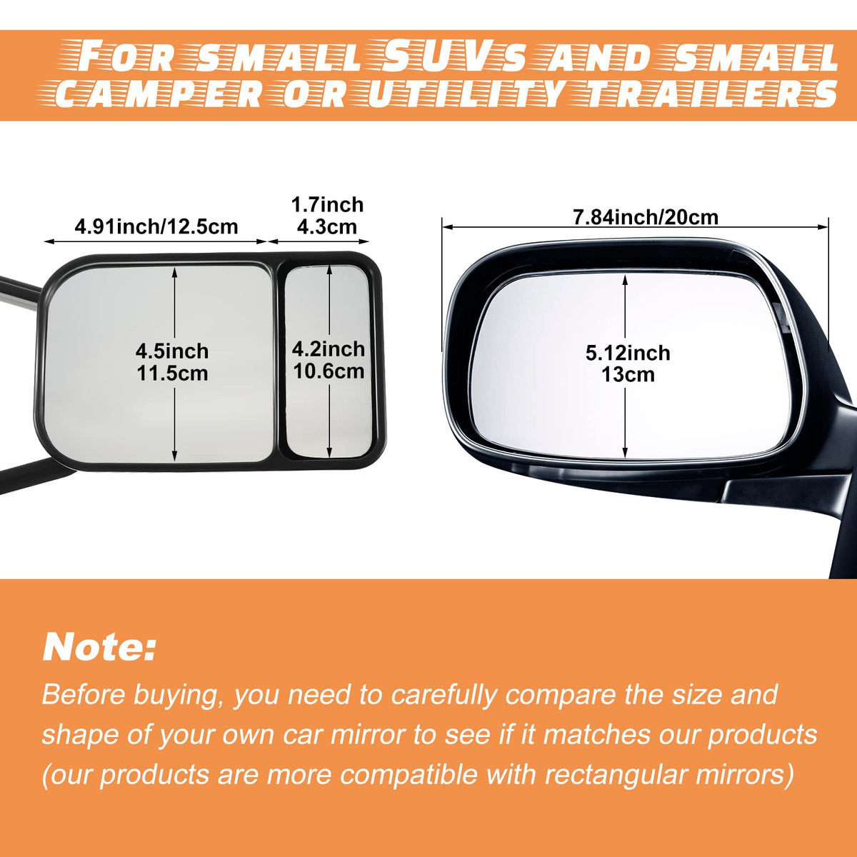Features: Serviceable And Lasting: Each Extended Towing Mirror Is Mainly Made Of Quality Glass And Pp, Reliable And Sturdy, Not Easy To Deform Or Break, And Can Be Kept For A Long Time. The Surfaces Of These Mirrors Are Smooth And Comfortable To Touch, Easy For You To Assemble. Adorable Present Supplies: Our Truck Mirror Extensions Are Ideal For You To Send To Your Family Members, Friends, Colleagues And More Who Have Cars, On Christmas, Halloween, Valentine'S Day And Other Festivals. They Will Feel Your Concern And Love, And Your Relationship Will Be Improved. Specifications: Main Material: Pp, Glass Color: Black Size: Bigger Mirror: Approx. 12.5 X 11.5 Cm/ 4.9 X 4.5 Inches Smaller Mirror: Approx. 10.6 X 4.3 Cm/ 4.2 X 1.7 Inches Rubber Belt: Approx. 2.1 X 39 Cm/ 0.8 X 15.4 Inches Quantity: 2 Pieces Package Includes: 2 X Black Car Towing Mirrors Notes: Manual Measurement, Please Allow Slight Errors On Size. The Color May Exist Slight Difference Due To Different Screen Displays. Small Parts Are Included, Please Keep Away From Children Under 3 Years Old.