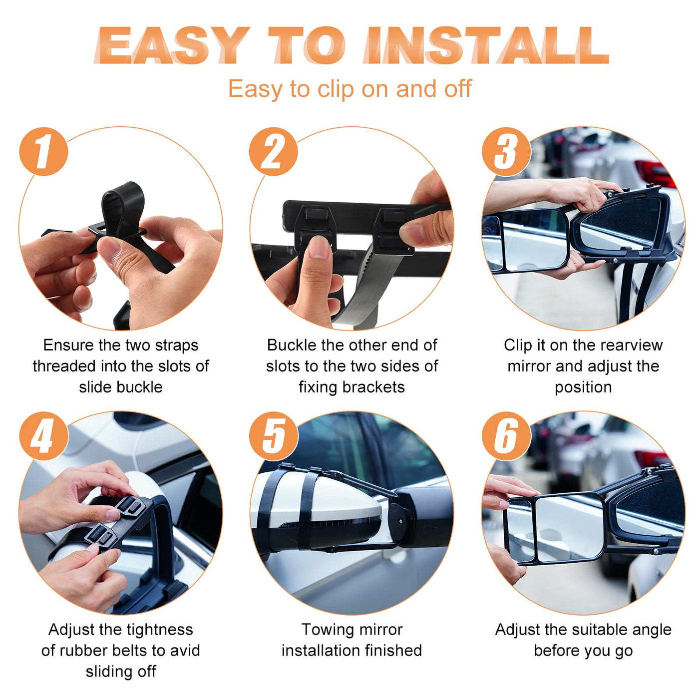 Q: Are these towing mirrors easy to install?A: Yes, the Black Car Towing Mirrors come with adjustable clips and rubber belts that ensure easy installation. The rubber strap has an anti-slip function, helping to stabilize the mirror during use.