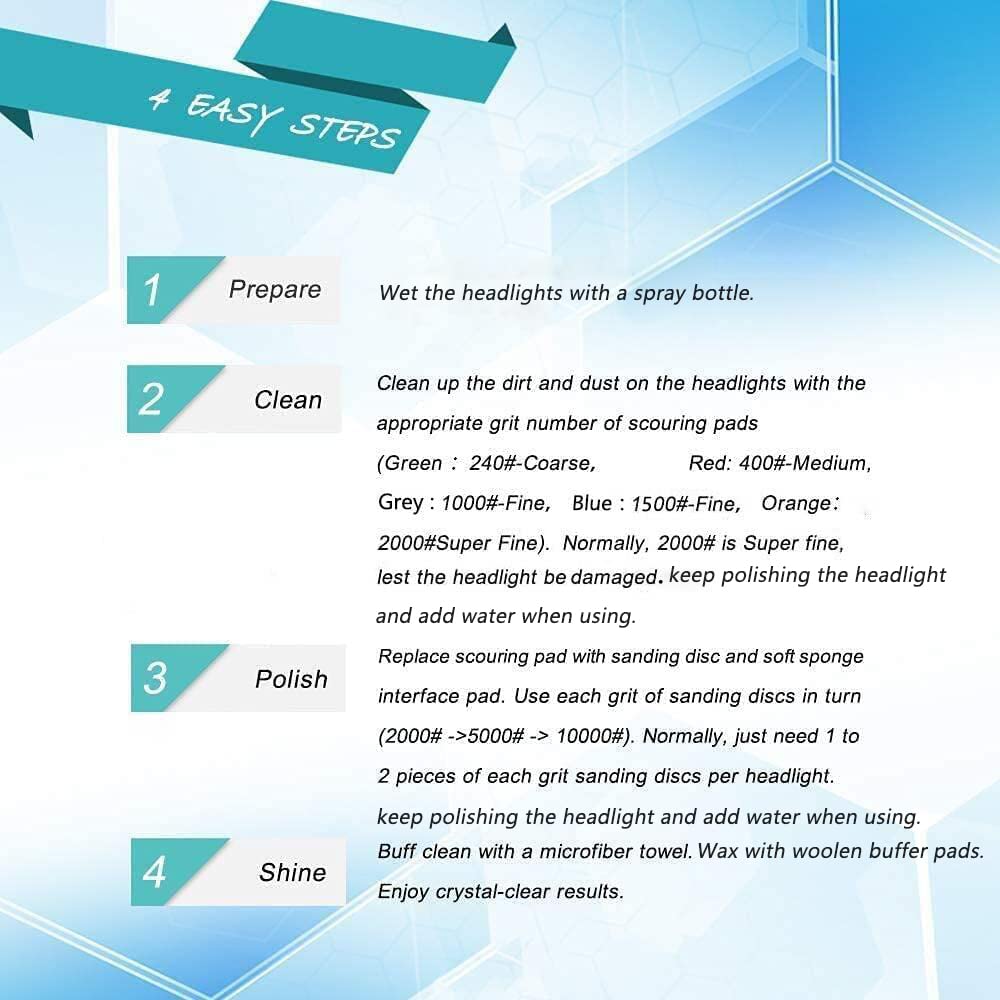 Q: How does the headlight restoration process work?A: The headlight restoration process involves using the included sanding discs to gently buff away oxidation and discoloration from the headlight lens, followed by polishing with the woolen buffer pads to achieve a clear, like-new finish.