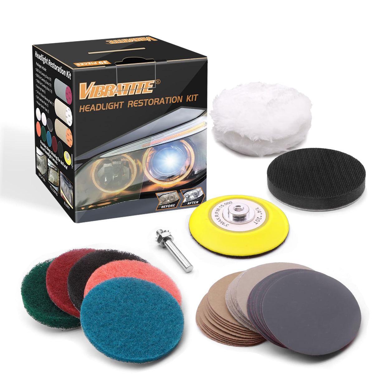 Q: What is included in the 3 Inch Car Headlight Restoration Kit?A: The kit includes 39 pieces, featuring sanding discs ranging from 2000 to 10000 grit, a 1/4 inch shank backing pad, scouring pads, a soft interface pad, and woolen buffer pads, providing a comprehensive solution for headlight restoration.