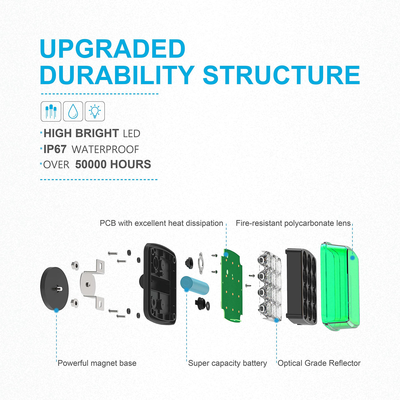 6 inch Wireless Led Emergency Strobe Lights Power: 15W Operating Voltage: 12-24V Current: 1.35A Raw Lumens: 800LM Beam: 30 degree Spot. Working Temperature: -40 ~ 85 degree Celsius. Dimension: L 4.3” x W 4” x Width 1.4”. Protection Rating: IP67. Color Temperature: 2700K. Material: ABS Base, PC Lens. Charging port: Micro USB. Charging time: Less than 3 hours. Working time: Above 8 hours. Working Life: Over 50,000 hours. Charge and discharge protection. Certified by ECE R10, CE & RoHs.