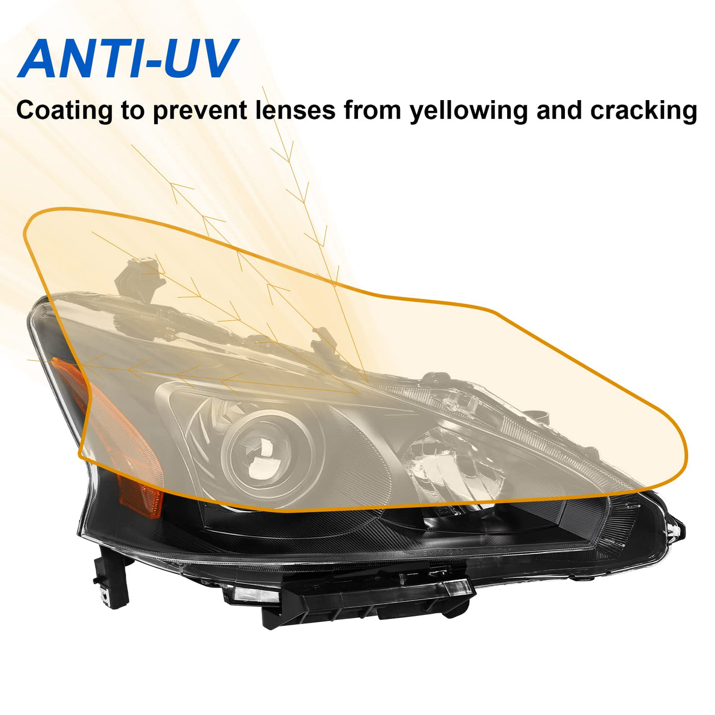 Q: Are the headlight lenses treated to prevent yellowing?A: Yes, all headlight lenses in the Alziria Headlight Assembly come with an anti-yellowing and anti-aging coating to maintain clarity and performance over time.