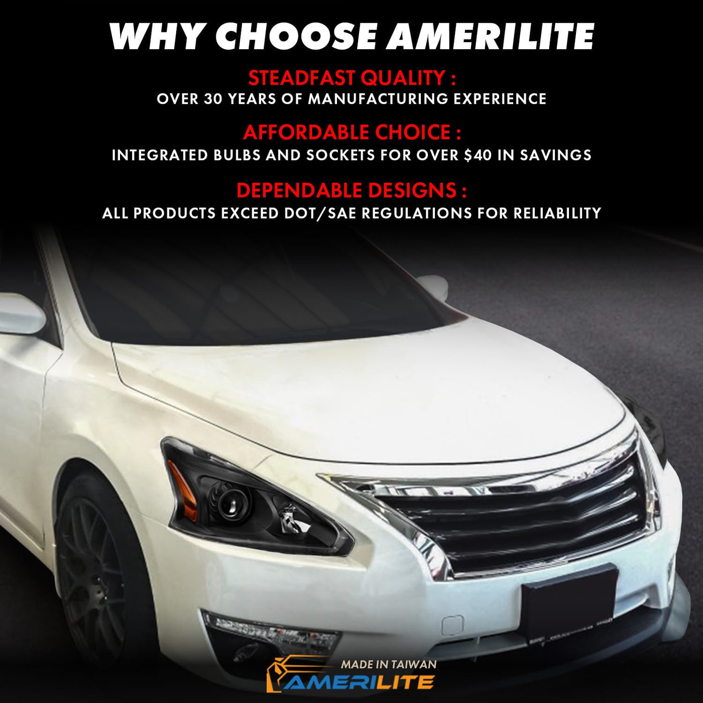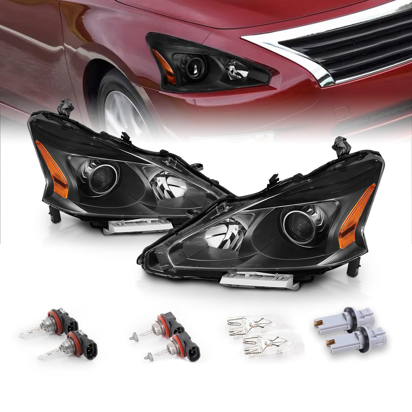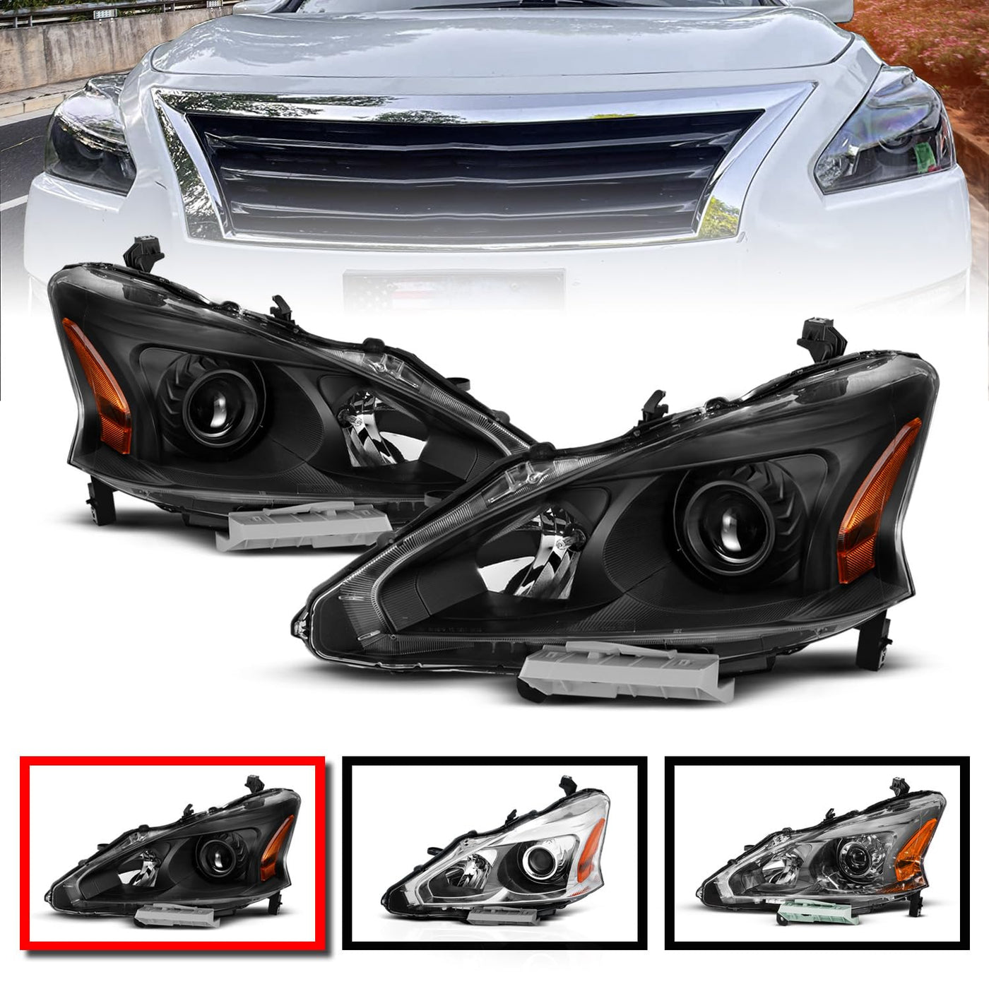 AmeriLite 2013-2015 Projector Housing Replacement Halogen Car Headlight Pair For Altima 4Dr Sedan With Bulbs - Driver and Passenger Side, Vehicle Light Assembly, Black