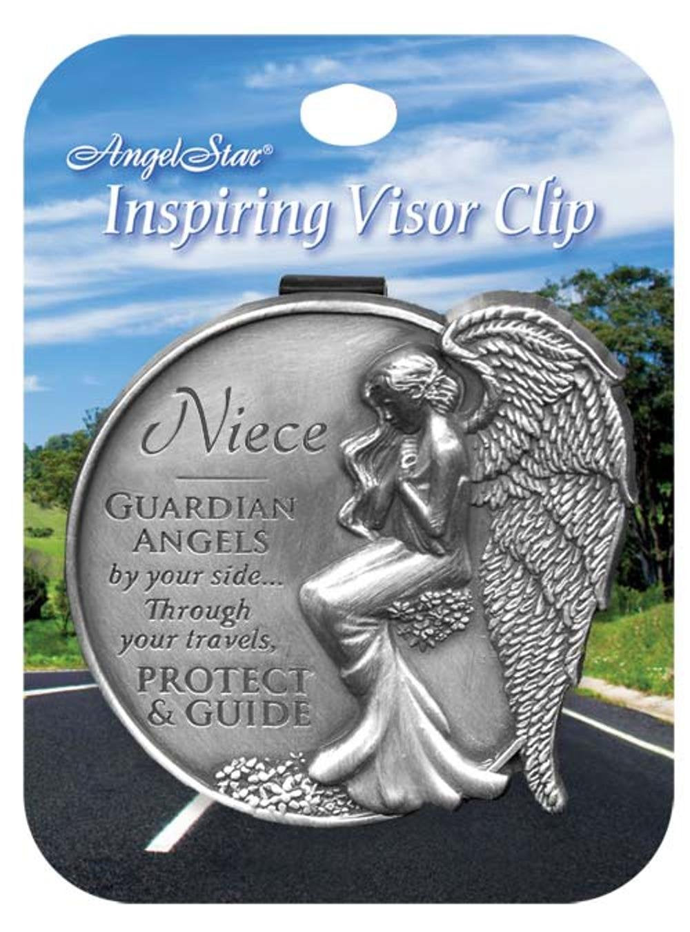 Q: What is the purpose of the Angelstar Niece Guardian Angel Visor Clip?A: The Angelstar Niece Guardian Angel Visor Clip serves as a reminder for drivers, featuring an inspirational message that reads, 'niece - guardian angels by your side; through your travels, protect and guide.' It is designed to promote safe driving while providing emotional support.