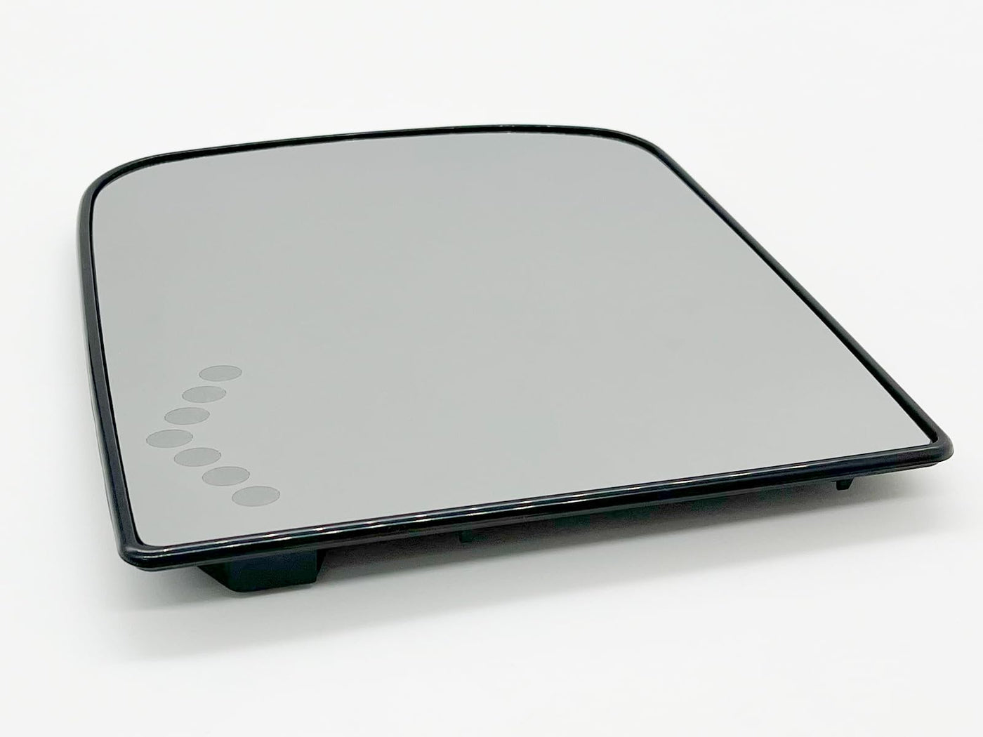 Q: What features does this towing mirror glass offer?A: This towing mirror glass features power adjustment, a flat glass surface, a built-in LED turn signal light, and a backing plate designed specifically for trailer tow mirrors.