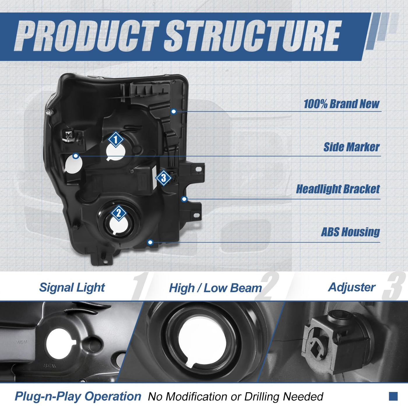 A Headlight (headlamp) is a lamp attached to the front of a vehicle to light the road ahead. Headlight performance has steadily improved throughout the automobile age, spurred by the great disparity between daytime and nighttime traffic fatalities. Headlights are one of the most important components of your vehicle; they allow you to see the road in front of you clearly during the night and in any bad weather that may arise. Our headlights upgrade the face of your vehicle with clear style and extreme range.Package Included:1 x Pair of HeadlightsThis product is compatible with:11-16 Ford F-250 / F-350 / F-450 / F-550 Super Duty