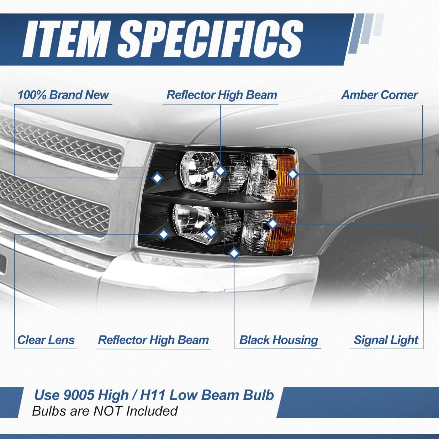 A Headlight (headlamp) is a lamp attached to the front of a vehicle to light the road ahead. Headlight performance has steadily improved throughout the automobile age, spurred by the great disparity between daytime and nighttime traffic fatalities. Headlights are one of the most important components of your vehicle; they allow you to see the road in front of you clearly during the night and in any bad weather that may arise. Our headlights upgrade the face of your vehicle with clear style and extreme range.Package Included:1 x Pair of HeadlightsThis product is compatible with:Compatible with Chevy Silverado 1500 2007-2013Compatible with Chevy Silverado 2500HD 3500 2007-2014For 2007 Models, does NOT Fit Classic ModelsFits Models with Halogen Headlights OnlyMake Sure the Body Style Before Purchase
