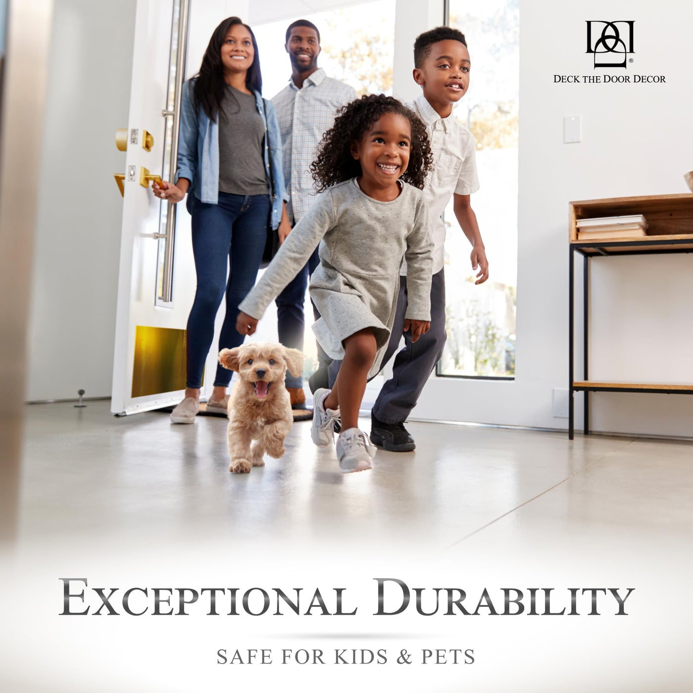 Boost the beauty and fortitude of your home's entryway door with a Deck the Door Anodized Aluminum Kick Plate. Designed and constructed with precision, it’s not just a protective barrier but also a charming addition to your home's facade. Made in the USA from durable anodized aluminum, our kick plates are UV and abrasion resistant, ensuring longevity and elegance for years. The superior protection shields against rust, tarnish, fading, and abrasions. Simple minimal maintenance—just wipe clean with soap and water to keep the plate looking its best. With a variety of sizes and finishes available, you get an adaptable style to complement your home or office interior or exterior. Choose a shiny or satin plate that fits the look and feel of the entry space. The easy 1-minute installation uses strong industrial 3M tape, included with your door plate. Deck the Door’s family-owned business is on a mission to help you level up your home, one custom door kick plate at a time! Started by Tucker and his mother Laurie over a decade ago, our company has grown from humble at-home beginnings to vast scalable production lines. Monica joined our caring team in 2019 and we’re all committed to offering the highest quality, most sophisticated door kick plates available. It makes a lovely, noticeable difference.