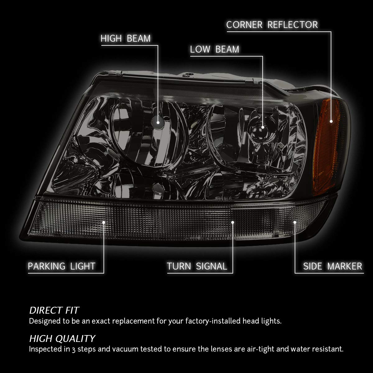 Dna Motoring Hl-Oh-Jgc99-Sm-Am Smoked Amber Headlights Assembly Replacement Compatible With 99-04 Jeep Grand Cherokee