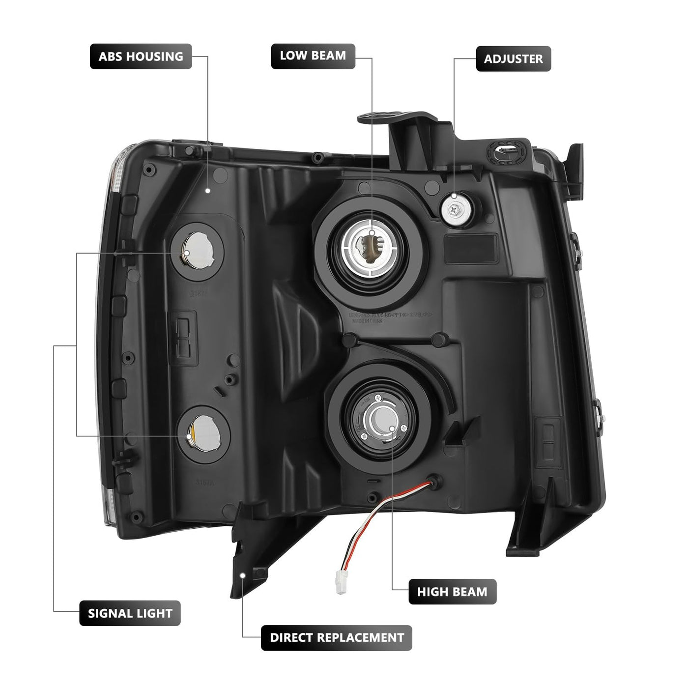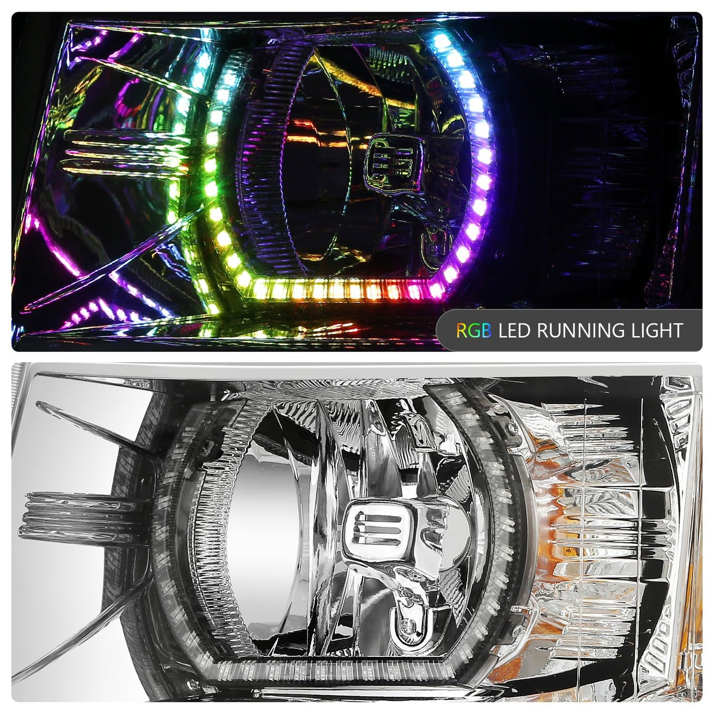 FITMENT: Compatible with Chevy Silverado 1500 2007-2013; Silverado 2500 3500 & HD Models 2007-2014; Does NOT fit 2007 Old Body Classic Models; Fits Models with Factory Halogen Headlights Only | FEATURES: RGB LED Cup Style Halo Running Light; Start Up Sequence Light Show when first Turning on Headlights | PACKAGE INCLUDES: Comes with a Complete Set of Headlights (Driver and Passenger Side); Great for Show Use or to Replace Old and Worn Headlights | QUALITY CONSTRUCTION: Made of High-Quality ABS Plastic Housing and Polycarbonate Lens for Long-Lasting Durability | DIRECT REPLACEMENT: Plug-n-Play Operation, Direct Bolt-on OE Fitment or Replacement for the Stock Unit; Requires wiring LEDs to Factory Wiring Harness