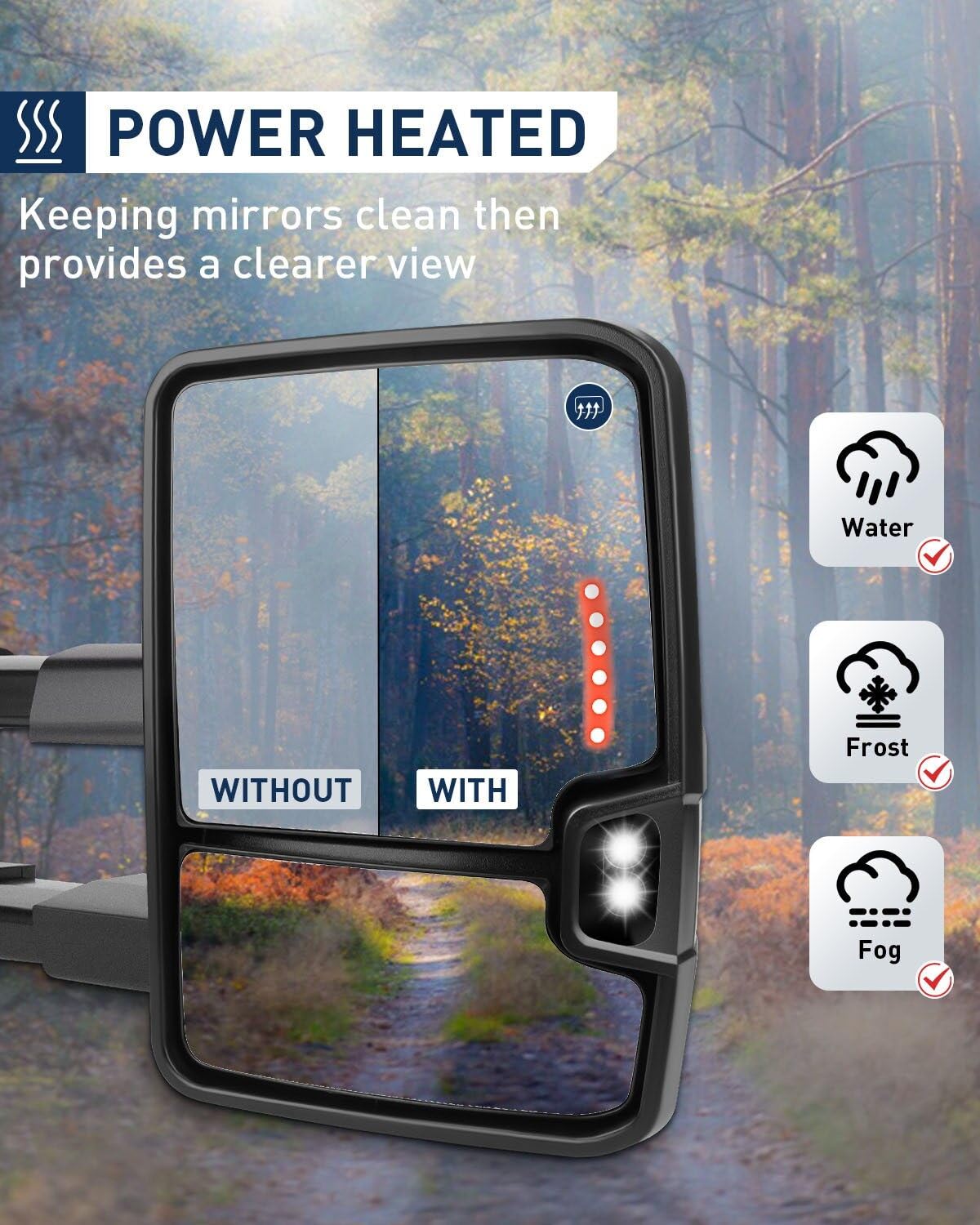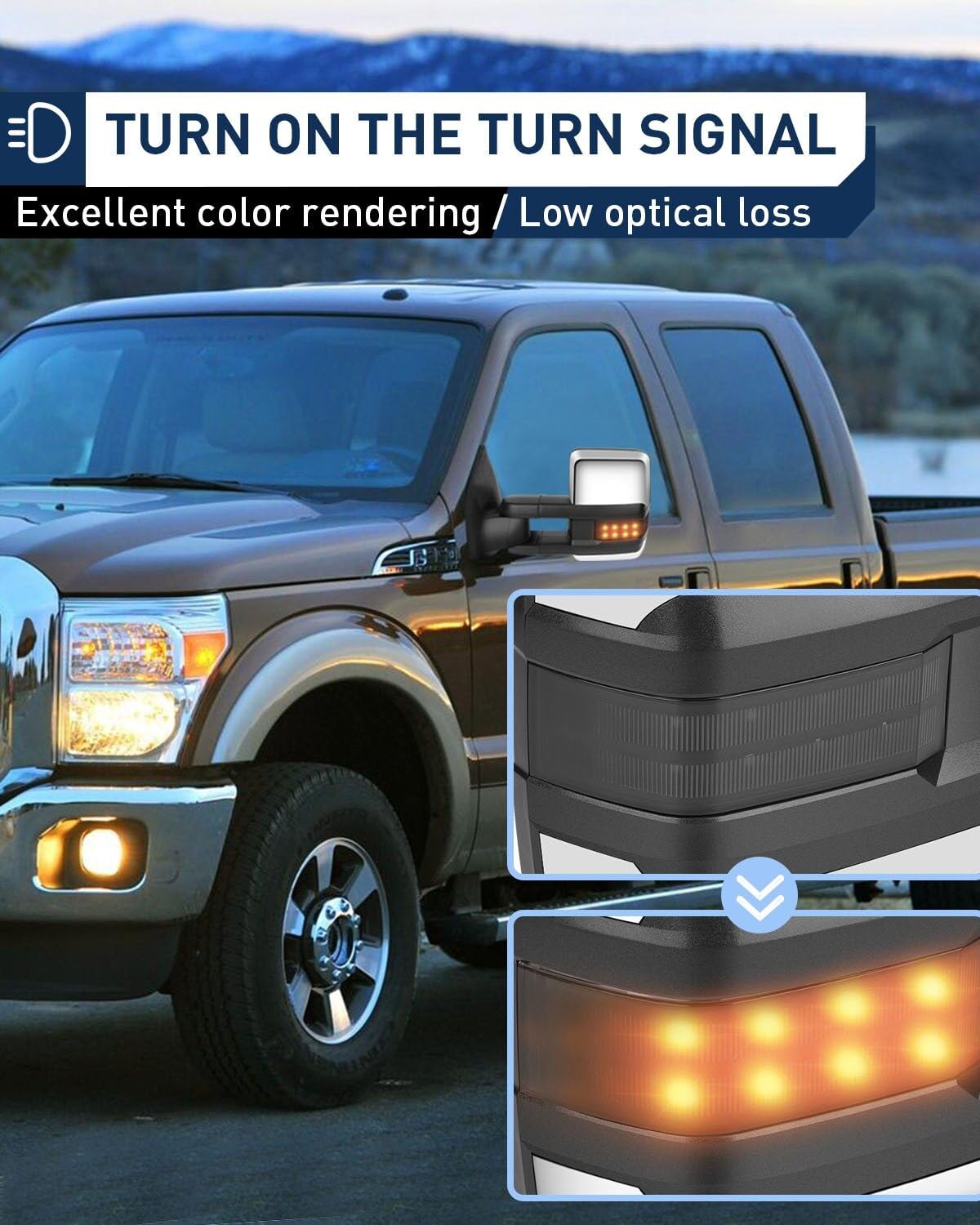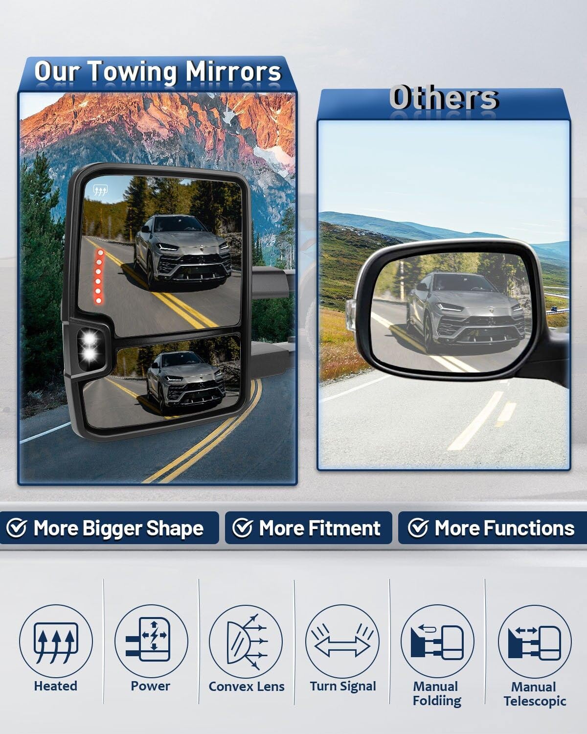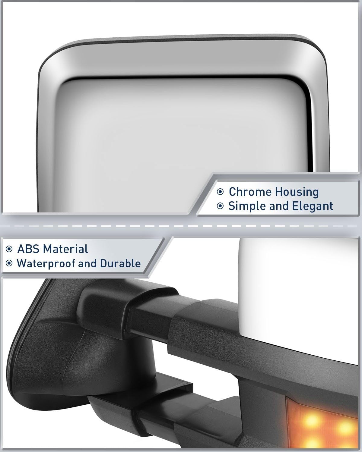 Q: What safety features do these mirrors include?A: These mirrors feature built-in turn signals that activate when you signal a turn, alerting other drivers and helping to reduce the risk of accidents. Additionally, the extendable mirror arm provides a wider visual area, further enhancing safety while towing.