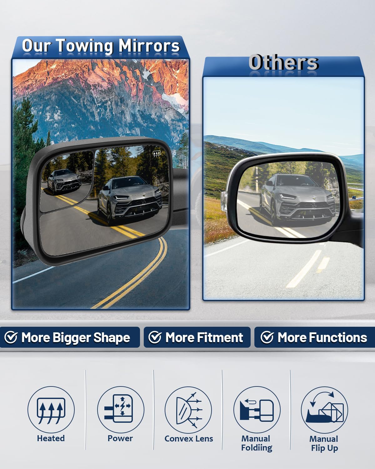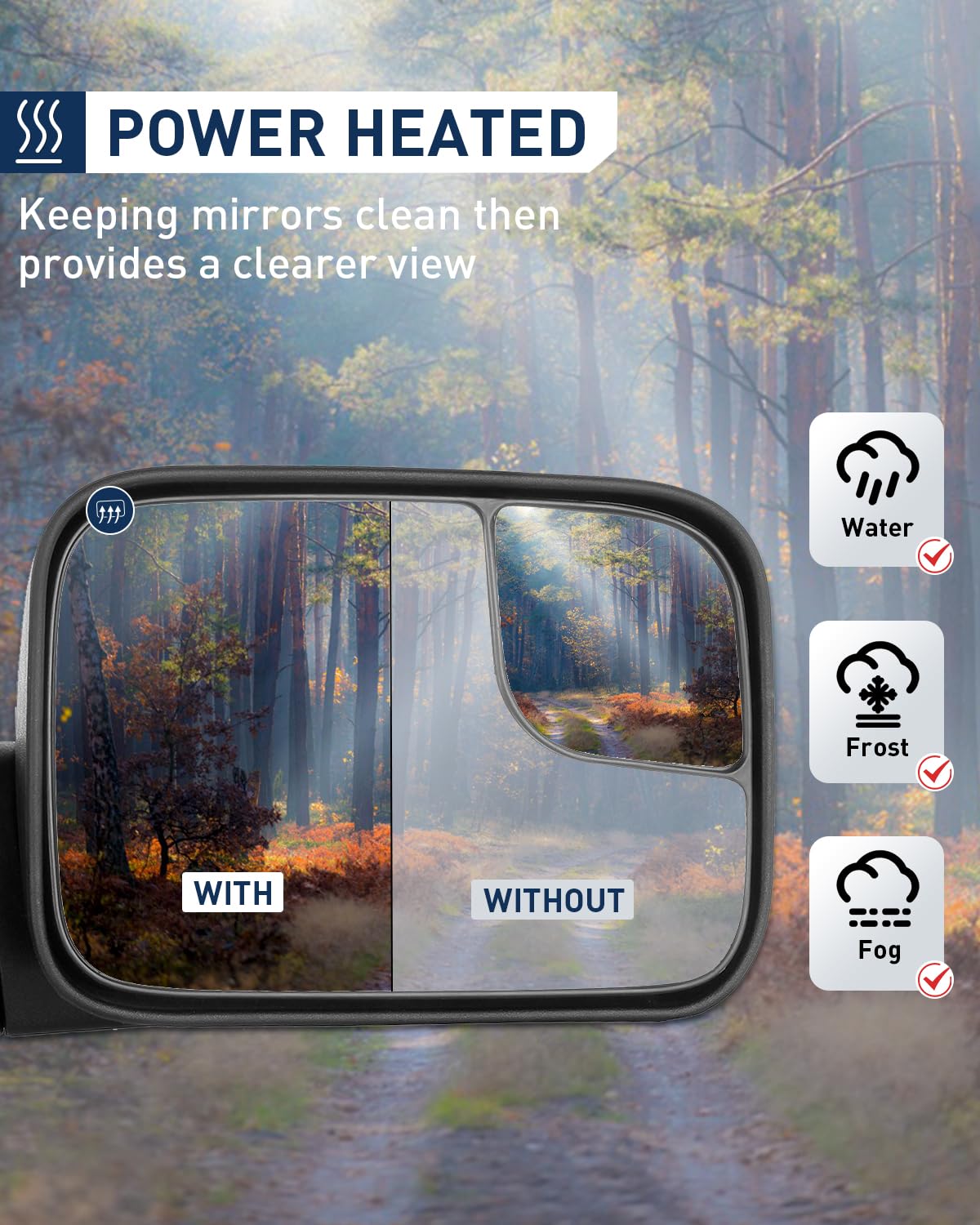 Q: Do these towing mirrors have heating features?A: Yes, the towing mirrors feature a heated function that helps to defrost and clear the glass for improved visibility in cold weather conditions.