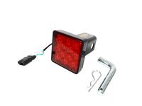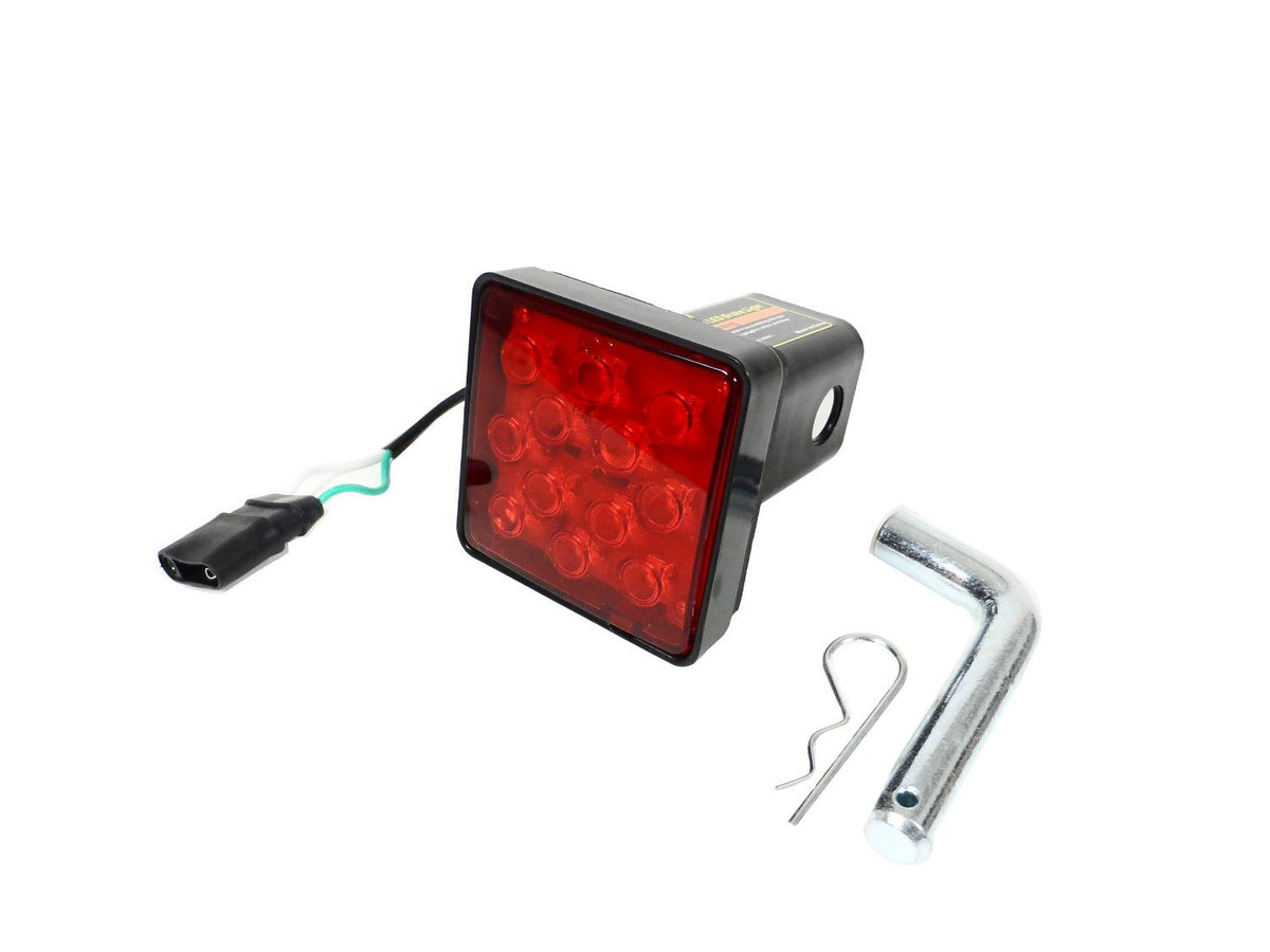 This new L.E.D. Tow Hitch Insert has 12 Bright Red LEDs and lights up everytime your brakes are applied. This hitch insert has a 12” long standard flat connector that plugs straight into the flat four tow light port on the back of the vehicle near the hitch. The Pin is included along with a square foam pad to prevent any play while in motion. Overall LED Light Dims: 3” x 3” Extra Technical Notes: Distance from back of light to center hole is: 2.75”