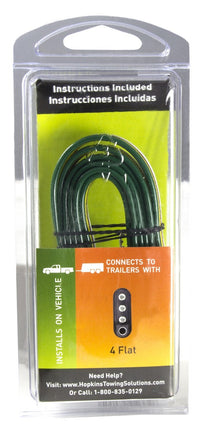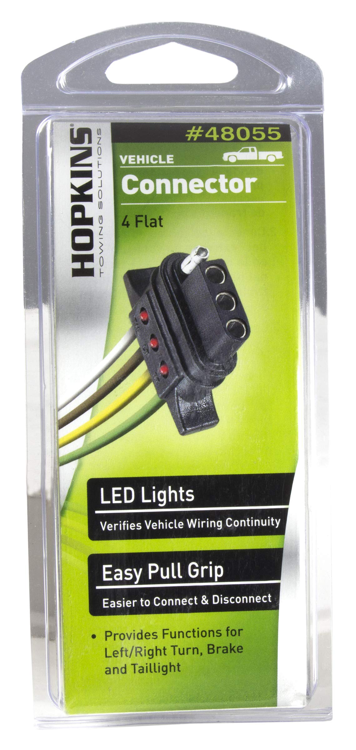 Hopkins Manufacturing Corporation makes your towing experience simpler and more rewarding through innovation and value. As an Endurance product by Hopkins, this product is designed for ultimate durability against harsh weather conditions, corrosion, and normal wear and tear. Hopkins offers a variety of towing solutions including vehicle wiring kits, adapters, vehicle and trailer connectors, breakaway systems, and much more. Today, more than 40 percentage of retail category sales are generated from Hopkins innovations. The struggle for disconnecting 4 flats is finally over. Hopkins' LED 4-Wire Flat helps solve the unknown with LED lights that illuminate when the trailer is connected to the tow vehicle, verifying that each function is working properly saving time during the setup and diagnosis processes. Get your vehicle ready to tow the most common type of trailer on the road by installing this vehicle side 4 flat. Most commonly used on small boats, utility, jet skis, and snowmobiles where marker lights are needed, it is available in SAE design and requires a 48-inch vehicle side connector. This LED wire verifies whether vehicle side wiring is correct and includes an integrated easy pull grip, as well as simple printed wire functions that make installation quick.
