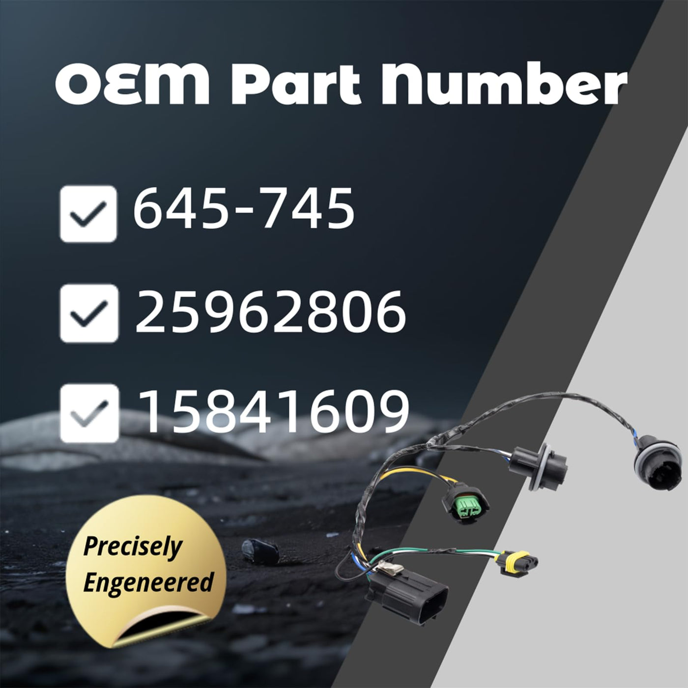 Q: How can I ensure this wiring harness is the right fit for my truck?A: To confirm compatibility, please check your vehicle's year, make, and model using the Amazon dropdown menu or compare with the original equipment numbers: 645-745, 15841609, and 25962806.