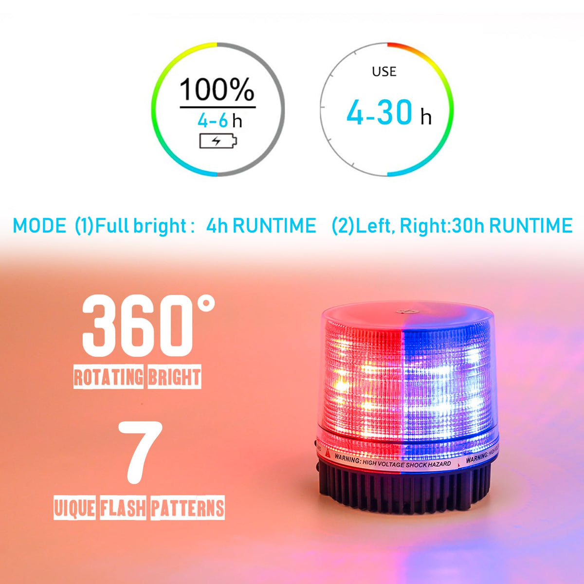 Our company specializes in all warning vehicles, fire lights, emergency lights, warning lights, police lights, police LED lights, construction lights, construction warning lights, visor lights and construction beacons. The Led Strobe Light bar is made of 18 high intensity leds and 6000 mAh Lithium battery. For snow plow, cop trucks, bus, police, emergency construction vehicle, postal service, safety warning etc. LE-JX offer comprehensive pre-sales and after-sales service. If you have any other questions,please contact us right now. Specifications All automobiles and devices equipped with a 12 Volt DC power source. Capacity:6000mah Charge voltage:4.2V Standard charging:4-6H Storage temperature:-15?~+55? Charging temperature:0?~+45? Size:4.5 4.5 4.5 Features 1. high intensity LED with wide optic lenses for maximum intensity. 2. Self-contained Led unit; no external flasher required. 3. 9 selectable flash patterns. (Full bright and Left, Right). 4. The Wireless Rotating Beacon is weather proof, it can be used under any conditions. 5. Angle adjustable mounting brackets. Product Inclue 1 x Wireless Rotating Beacon. 1 x Cigar Lighter Rechargeable Plug.