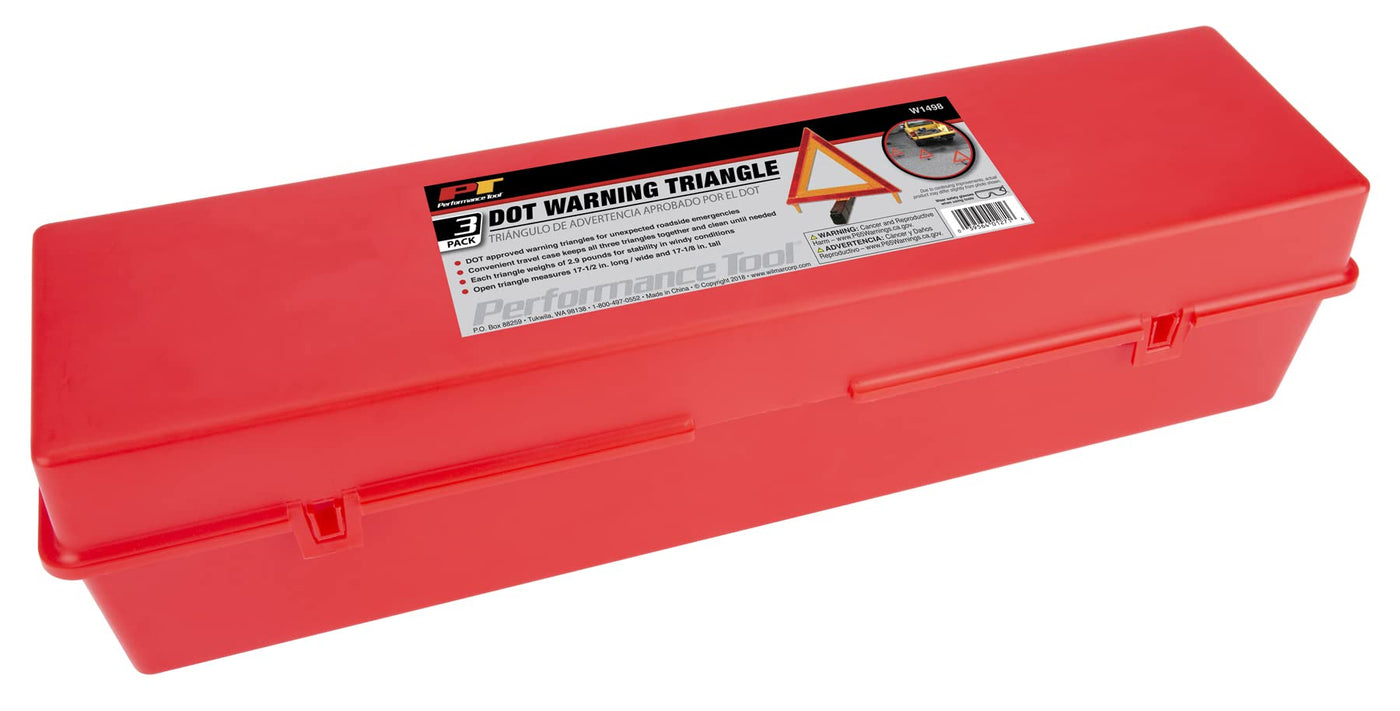 Q: What is included in the Performance Tool Emergency Reflective Triangle Set?A: The set includes three reflective warning triangles and a convenient travel case for easy storage and transport.