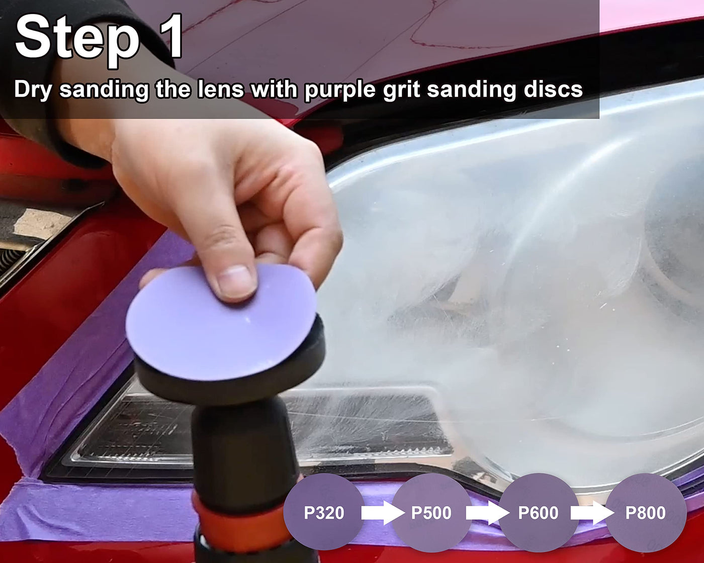 Restores Headlight: Enhances Visibility And Safety For Night Driving, Suitable For Most Homework Electric Drill. Professional: Provides Deep Clean To Yellowed, Hazed Headlights, Maintain And Protect All Types Of Smooth, Shiny Plastic And Acrylic Headlights To Crystal Clarity. Like-New Restoration Result Lasts For Up To 12 Months. Scope Of Application: For Use On Plastic Lenses Headlights, Taillights, Fog Lights, Directional Lights And More.Intended To Restore Two Plastic Headlight Lenses. Large Or Extremely Hazed Lenses May Require More Than One Kit. Easy To Use: 3-Step Process Requires As Little As Several Minutes To Remove Scratches And Restore Cloudy, Dull Lenses. What You Will Get: 4 Pcs Each Of 3 Inch 320,500,600,800 Purple Grit Sanding Discs, 4 Pcs Each Of 1000, 2000, And 3000 Orange Grit High-Precision Waterproof Sanding Discs, 1 - Disc Pad Holder, 1 - Buffing Sponge Pad.