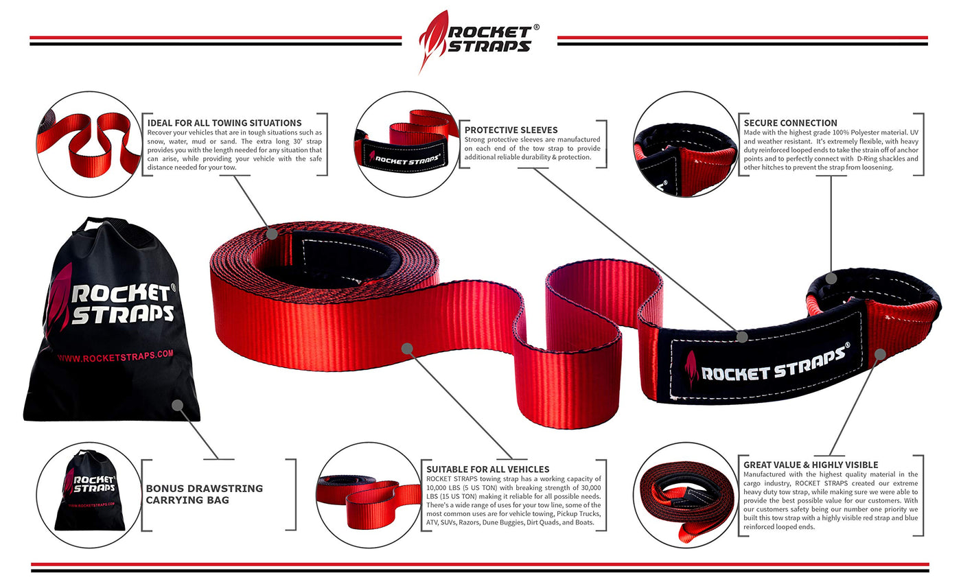 Rocket Straps Tow Strap - Premium Heavy Duty 3' x 30' Recovery Tow Strap | 30,000 LBS Capacity Recovery Strap | Vehicle Tow Straps with Protected Loop Ends | Emergency Off Road Towing Rope