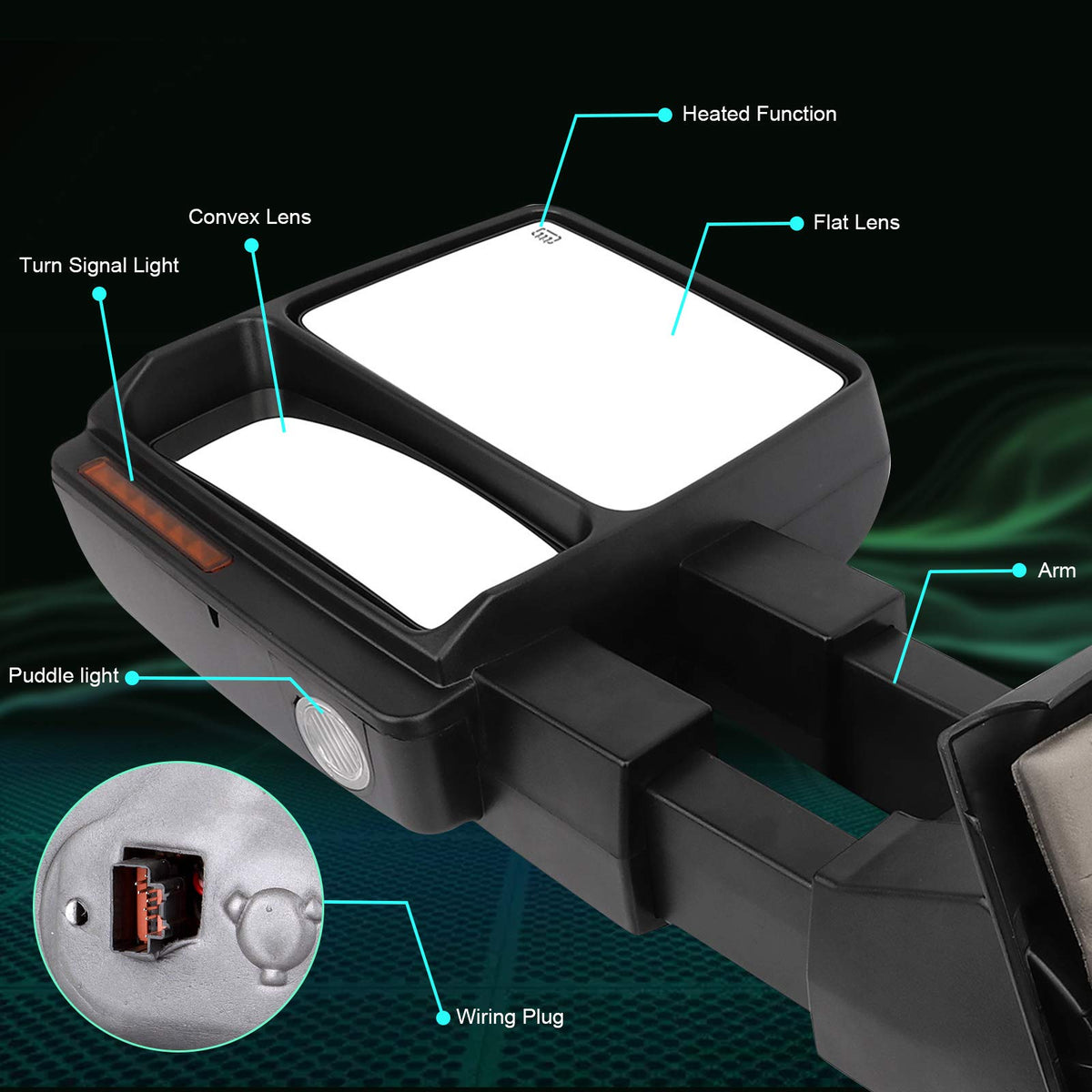 Item Sent From Our Warehouse In Usspecifications:-Fits Rh (Passenger Side) And Lh (Driver Side).-Power Control-Big Glass,Heated Function,Turn Signal Light,Manual Folding And Telescoping,With Black Housing.-This Is A Top Quality Mirror With Oe Standard.-These Mirror Come With The Function Of Manual Telescoping/Extend With Wide Angle Glass.-The Convex Glass Provides A Better And Wider Rear View Angle .-Perfect Quality Reflective Glass Ensures Less Distortion And A Clear Horizon.-Ultra Durable Abs Plastic In The Industry, 100% Watertight And Shock Absorption.-Built To Strict Quality Control Standards.-Easy Installation.-Upgrade Your Old Mirror With This Towing Heavy-Duty Towing Mirror.-These Mirrors Make Great Replacements And Have Good Cost Savings Over Dealer Units.-Same Footprint And Mounting Points As Factory Mirror.Compatible With:2007-2014 For Ford For F-150 Pickup Trucknote:1. The Mounting Base Studs For This Mirror Has Been Revised From The Original But Will Fit And Function Without Issue.2. This Mirror Will Only Work Properly On Vehicles With These Exact Options.3. If Your Vehicle Does Not Have The Options Listed, The Mirror May Not Function Properly.Package Including:Rh (Passenger Side) And Lh (Driver Side)
