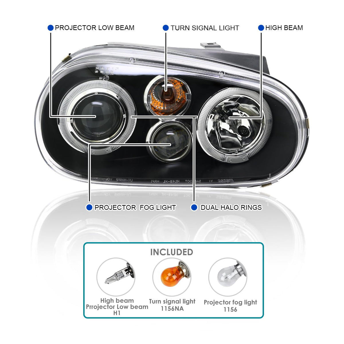 Spec-D Tuning Euro Black Projector Headlights Compatible With 1999-2006 Volkswagen Golf Mk4, 1999-2006 Volkswagen Gti, Left + Ri